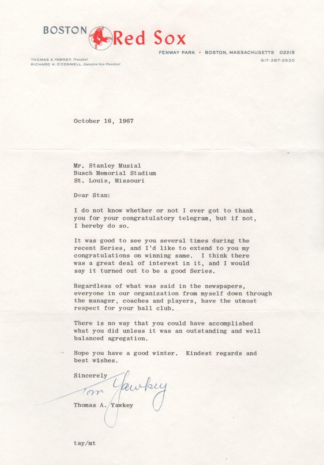 Here's the letter from Boston owner Tom Yawkey to Cards GM Stan Musial