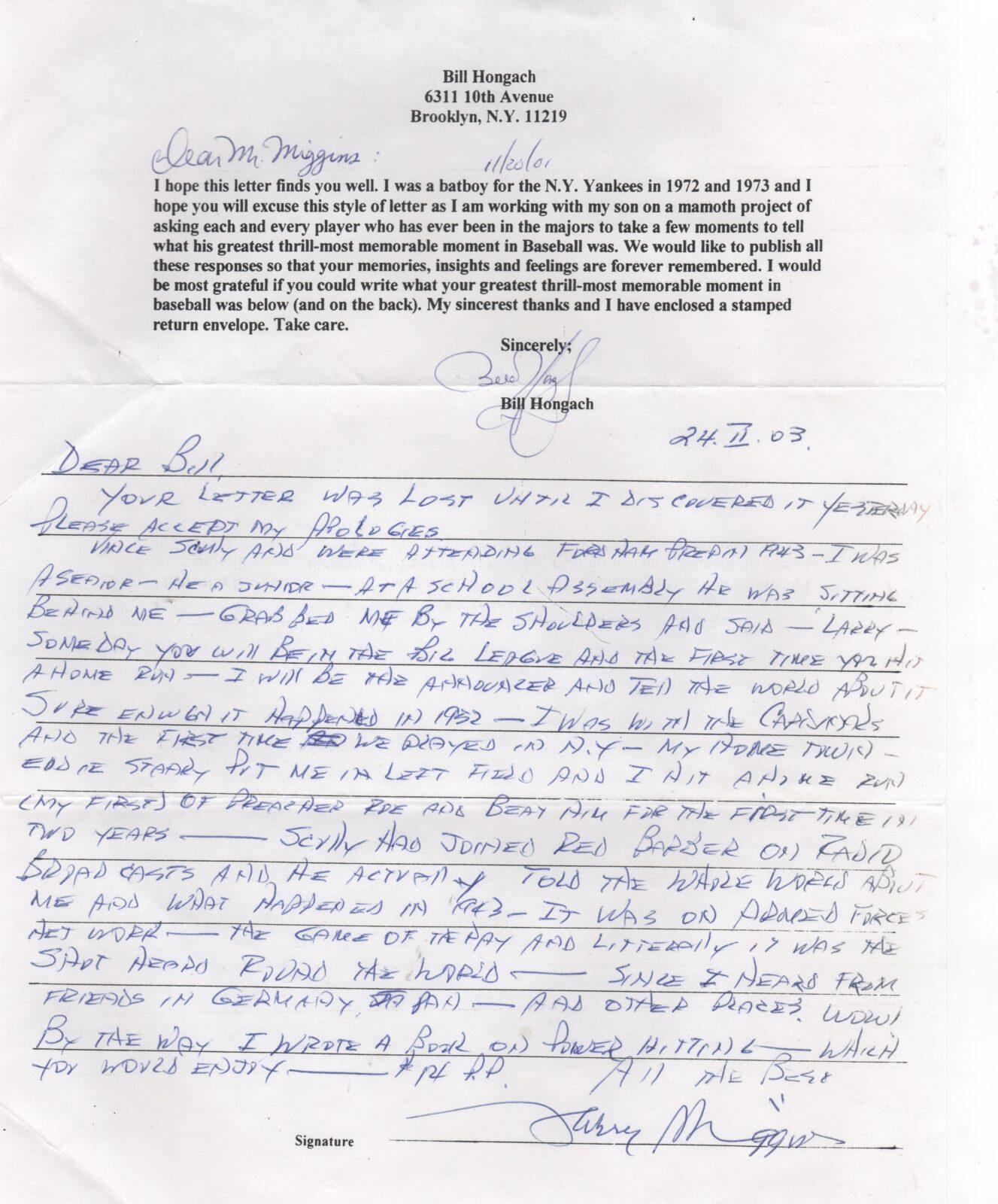 “Vince Scully and I were attending Fordham Prep in 1943,” Miggins wrote in a letter seen at the bottom of this page. “At a school assembly he was sitting behind me, grabbed me by the shoulders and said, ‘Larry someday you will be in the big leagues and the first time you hit a home run, I will be the announcer and tell the world about it.’