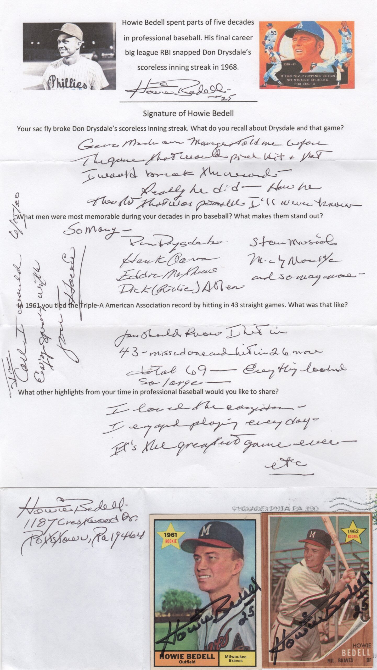 Bedell had just six more big league at bats after driving in the run that stopped Drysdale’s streak. His final season of his 13-year professional playing career came in a four-game stint with Double-A Reading in 1969. He time in the majors included 67 games, two doubles, a triple, and those three runs batted in. Bedell amassed more than 1,500 hits in the minors. In 1961 with Triple-A Louisville Bedell tied the American Association record by recording a base hit in 43 consecutive games. The league left affiliated baseball in 1997 with Bedell still tied atop the list.