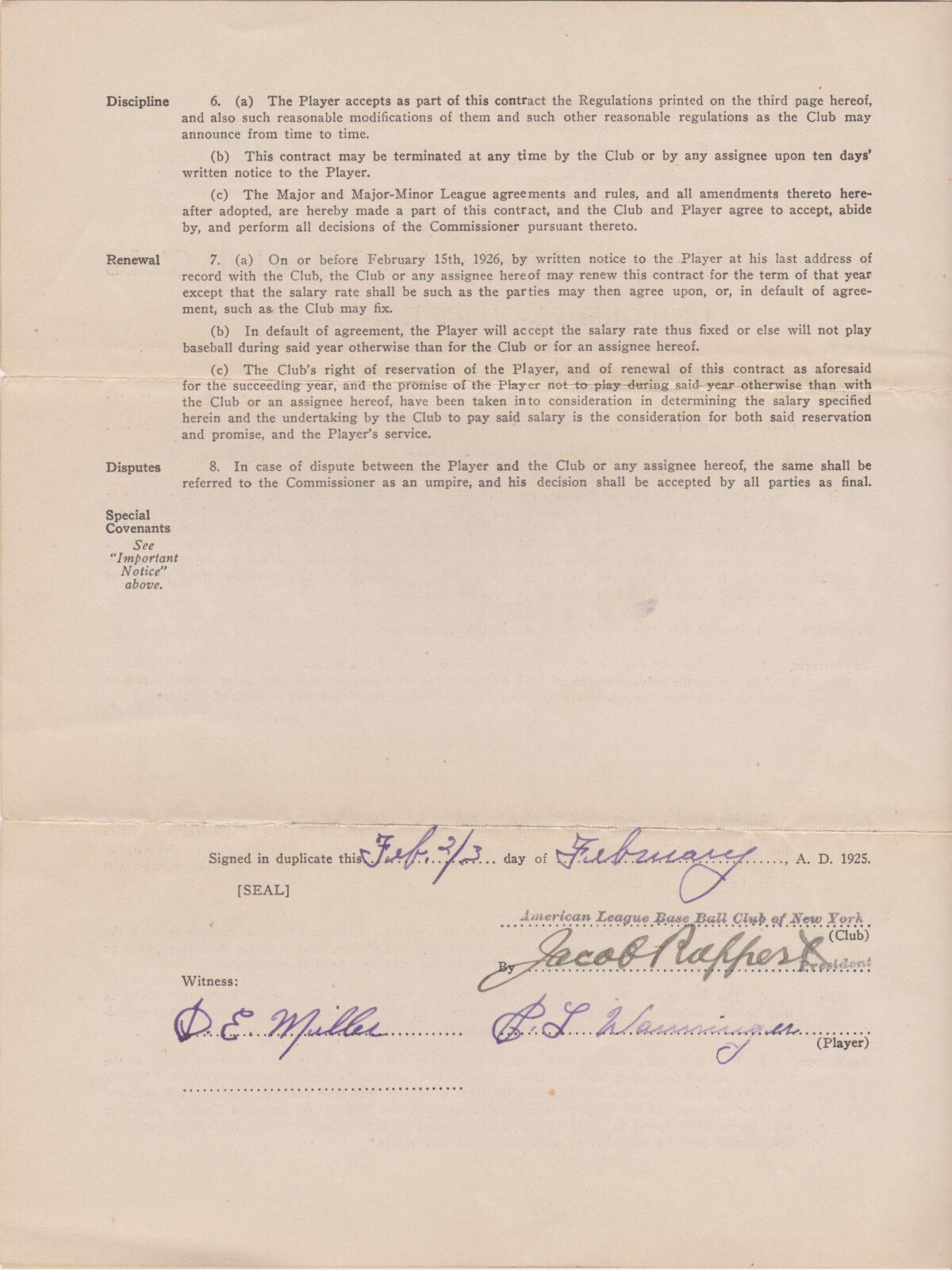 As stated in the previous piece’s description, Pee Wee Wanninger is the man for whom Lou Gehrig pinch hit to begin the Iron Horse’s consecutive games played streak. Shown here is the signature page for Wanninger’s 1925 player’s contract. Hall of Fame Yankee owner Jacob Ruppert signed the contract as club president, while