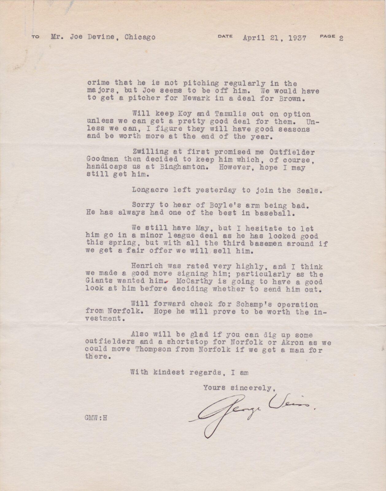 As head of the Yankees’ from 1932-1947, George Weiss intimately knew the inner workings of the team’s farm system and its minor leaguers. Here he writes to super scout Joe Devine about various personnel issues. First among them in the letter was Babe Dahlgren who had yet to play a game f