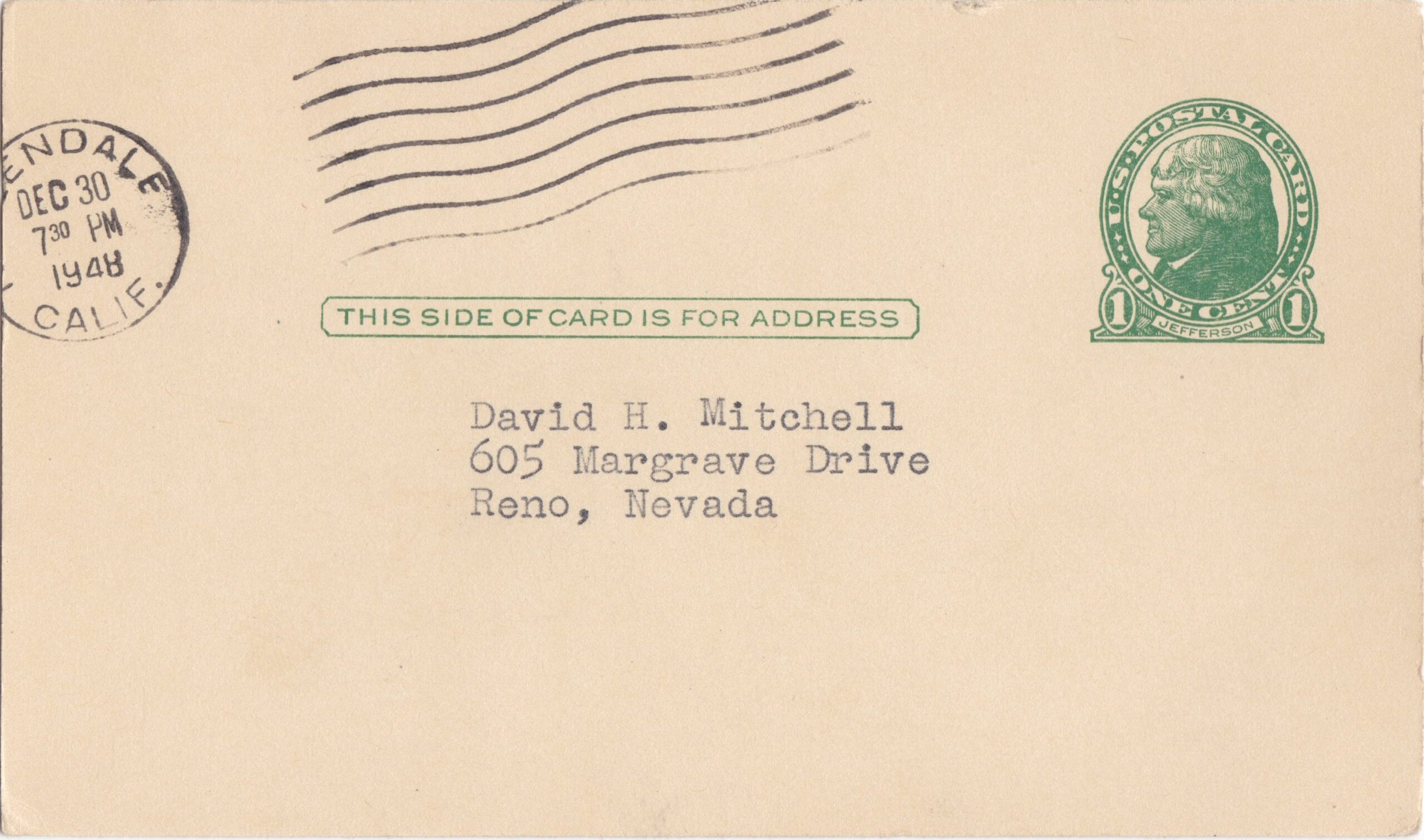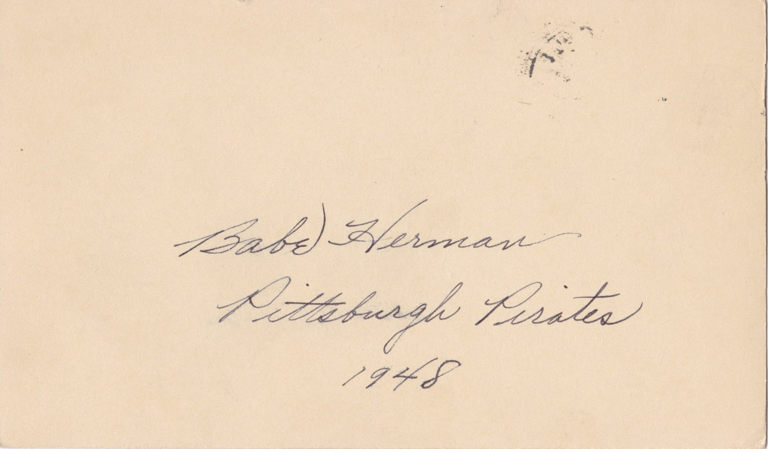 The image above shows the reverse of the government postcard signed by Babe Herman. The 13-year MLB veteran lived to the ripe old age of 84 and signed plenty of autographs. The postmark shown here reveals a mailing date of December 30, 1948 from Herman’s hometown of Glendale, California. Vinta