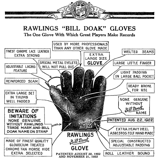 In 1920 he suggested to Rawlings that they place a web in the position between the thumb and the index finger to form a pocket in which to catch the ball. The Bill Doak glove became the standard throughout the game. Doak earned more money through the sale of his innovative gloves than he did for playing baseball.