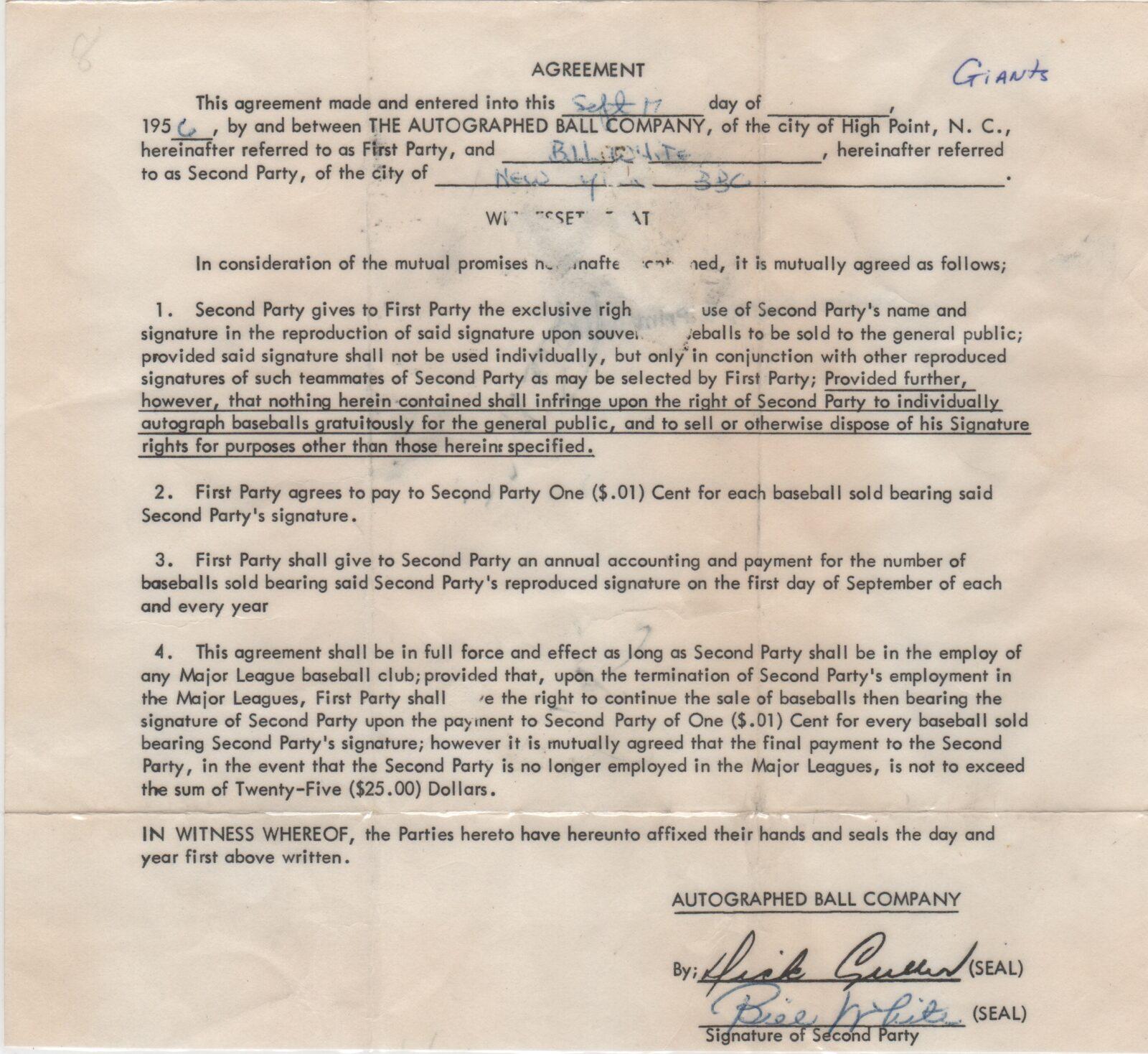 In the collection is this contract between the Autographed Ball Company and White. He gives the company consent for his signature to appear on baseball stamped with facsimile signatures. The terms of the deal granted White one penny per ball sold.
