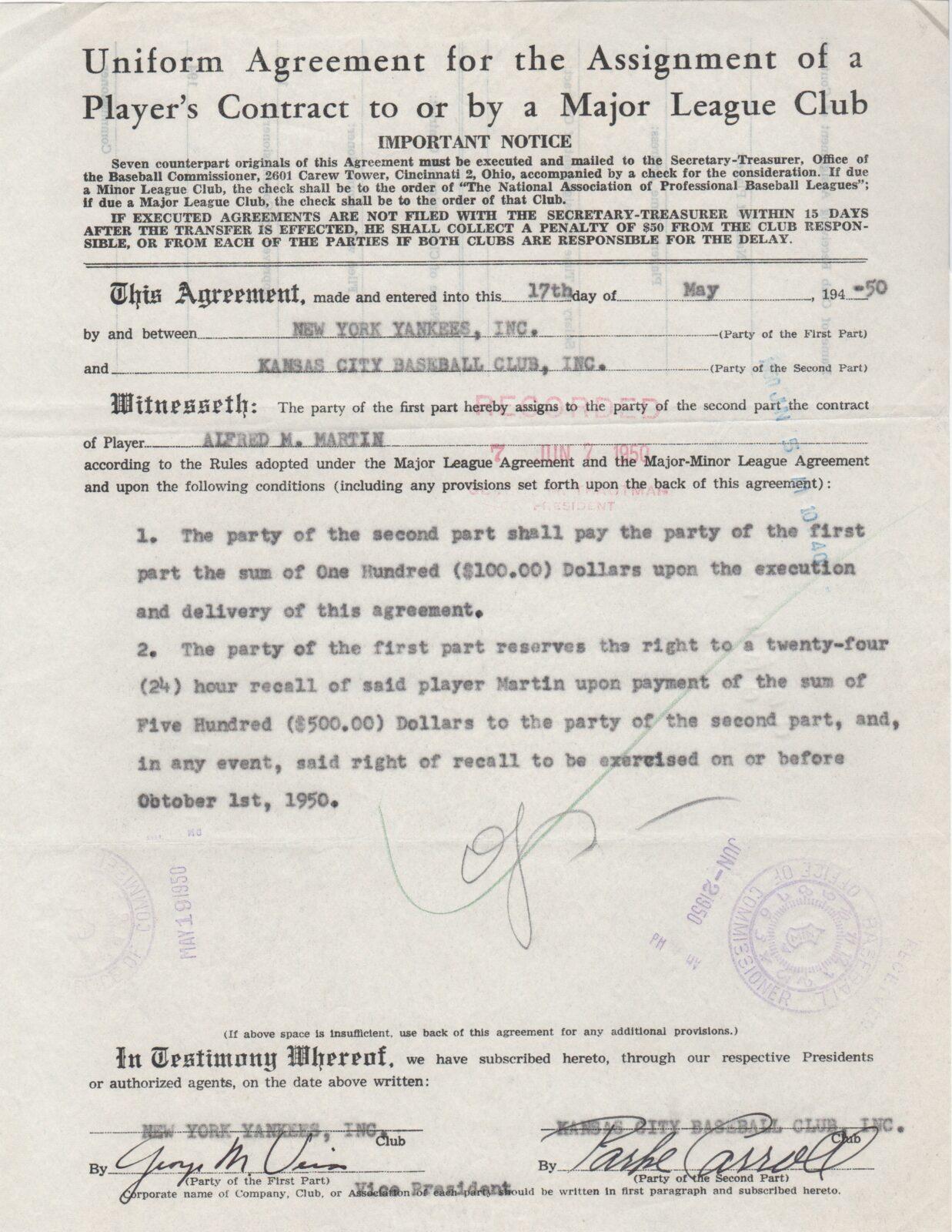 In the collection is the document that sent Billy Martin to Triple-A after just six big league games. It signed by Hall of Fame executive George Weiss and comes with quite a story. Martin was one of Casey Stengel’s favorites, having played for Stengel with the Oakland Oaks from 1947 and 1948.