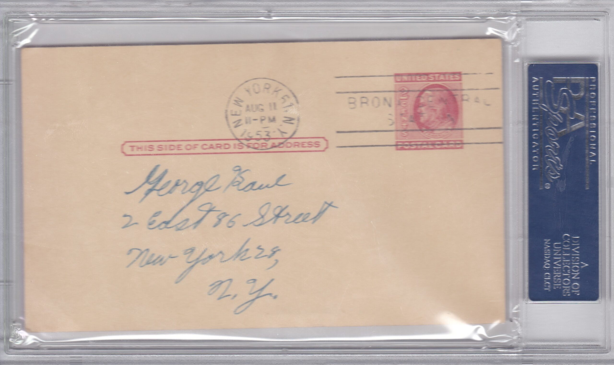 The image above shows the reverse of the card signed by Billy Martin. Notice the New York postmark from August 11, 1953 at 11:00pm. Less than 24 hours later the Yankees hammered Bucky Harris’ Washington Senators 22-1. Martin and Yankee catcher Yogi Berra combined for ten runs batted in. In the