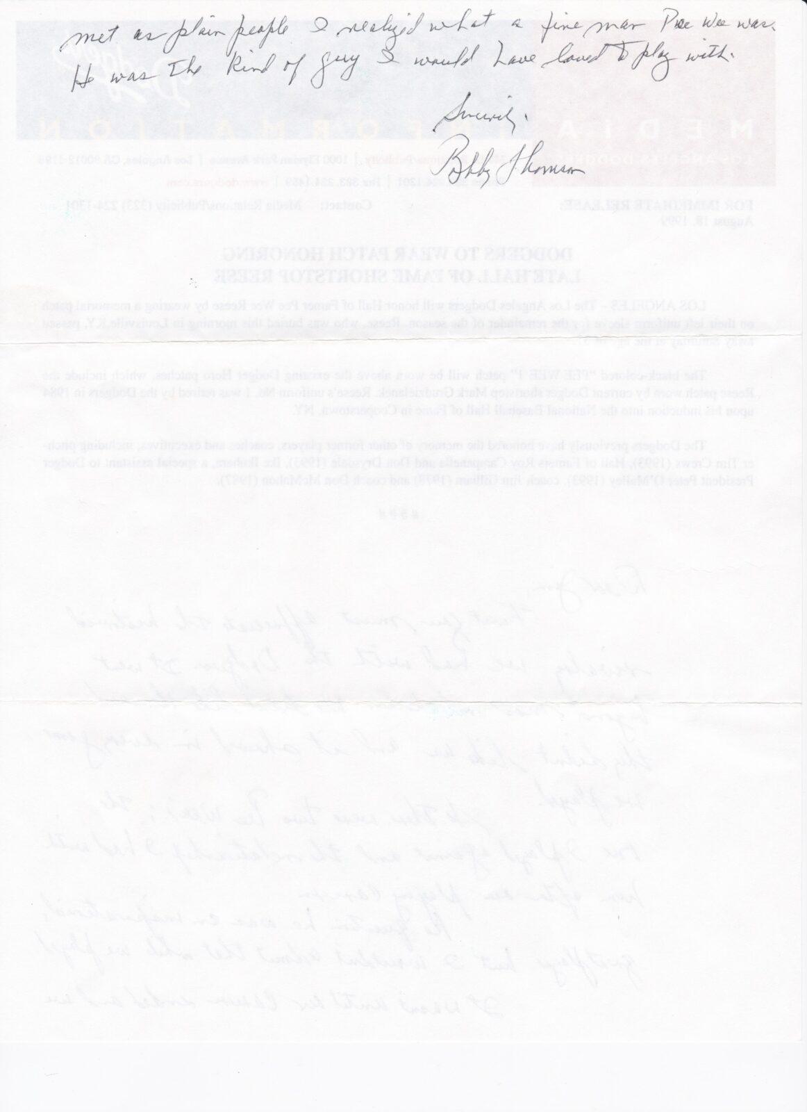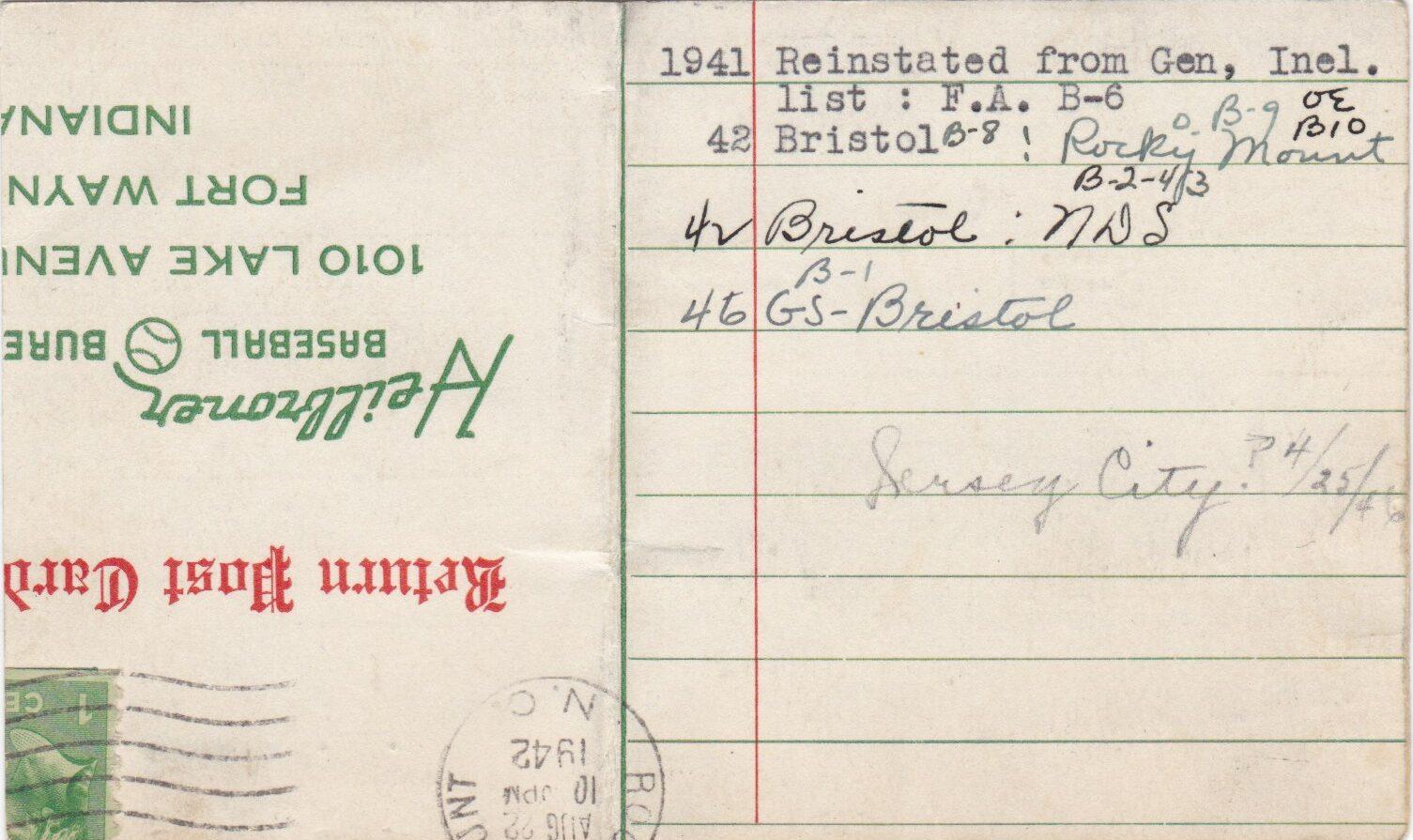 In the collection is this Heilbronner Baseball Bureau information card filled out and signed by an 18-year-old Bobby Thomson in 1942. He would play in Class D for just 34 games in ’42 season before enlisting in the US Army Air Corps for whom he serve until the end of World War II. This card was signed a full four years before Thomson’s MLB debut.
