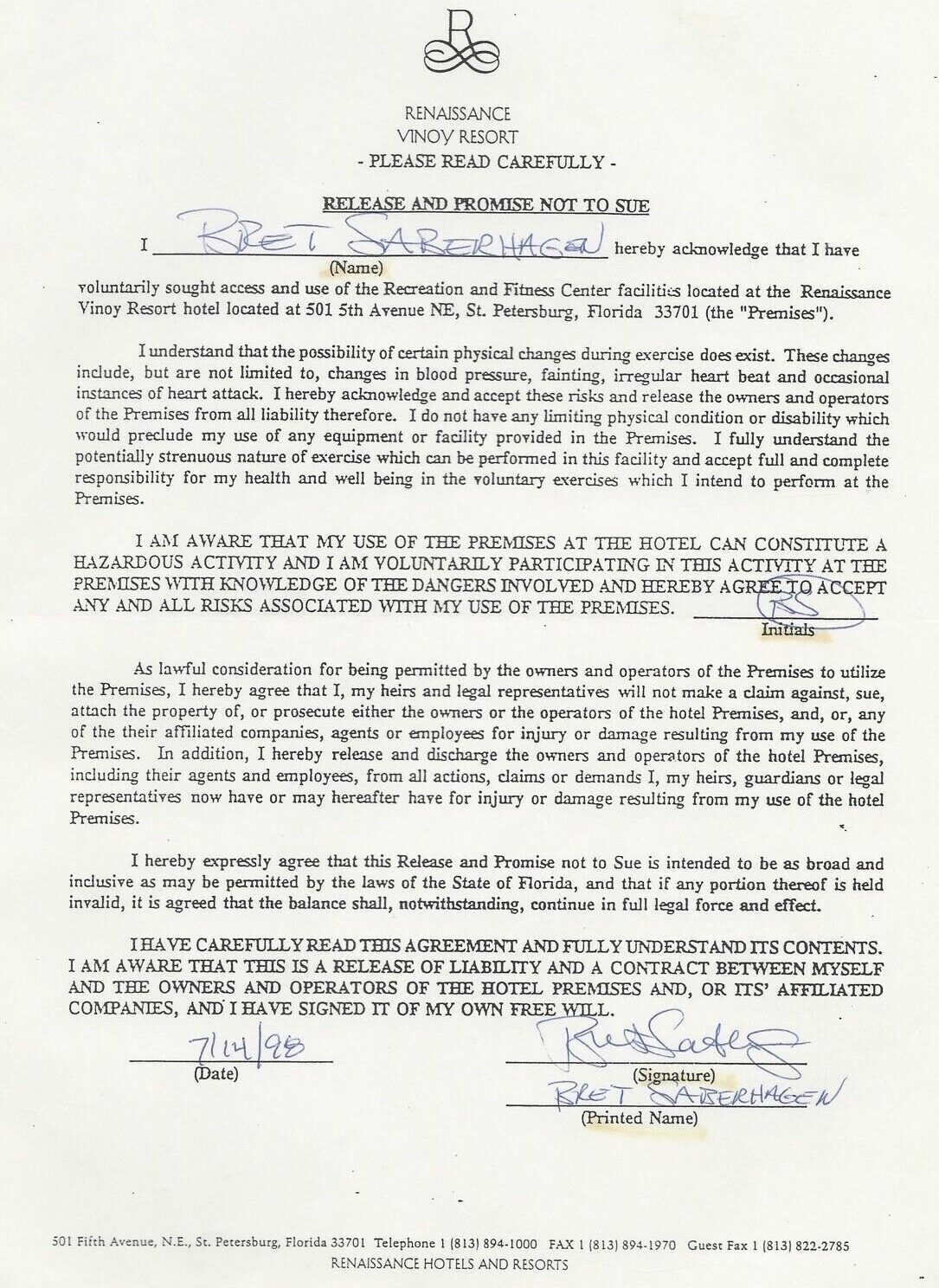 In the collection is this document signed by Saberhagen on July 14, 1998. That day Sabes took the mound against the Tampa Bay Devil Rays at Tropicana Field. Pitching for the Red Sox, he allowed 4 runs on 7 hits through 5 1/3 innings in a no-decision. For the season Saberhagen tossed 175 innings, going 15-8 with 100 strikeouts for the 92-win Boston club.