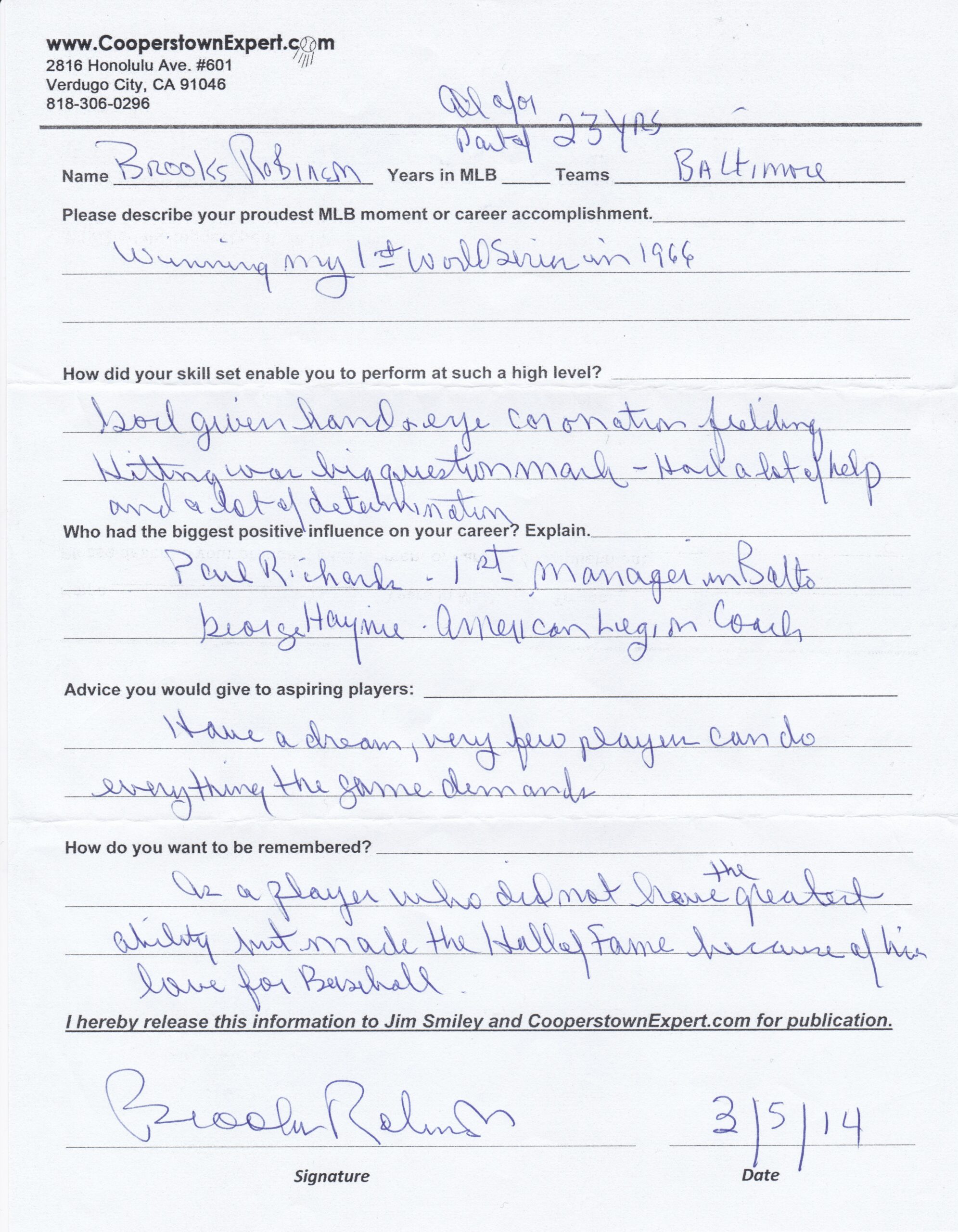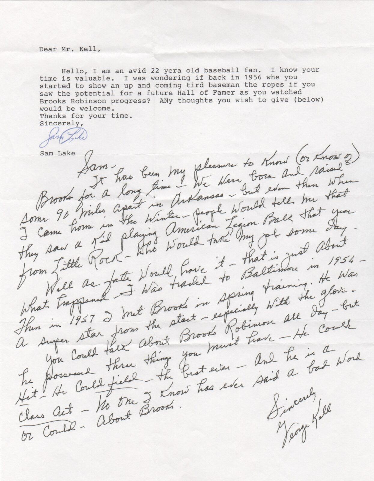 Here Brooks responds to a fan’s request to identify his greatest thrill. He writes, “My most exciting moment in baseball was the 1966 World Series. It was my first, a dream come true. Sincerely, Brooks Robinson”.