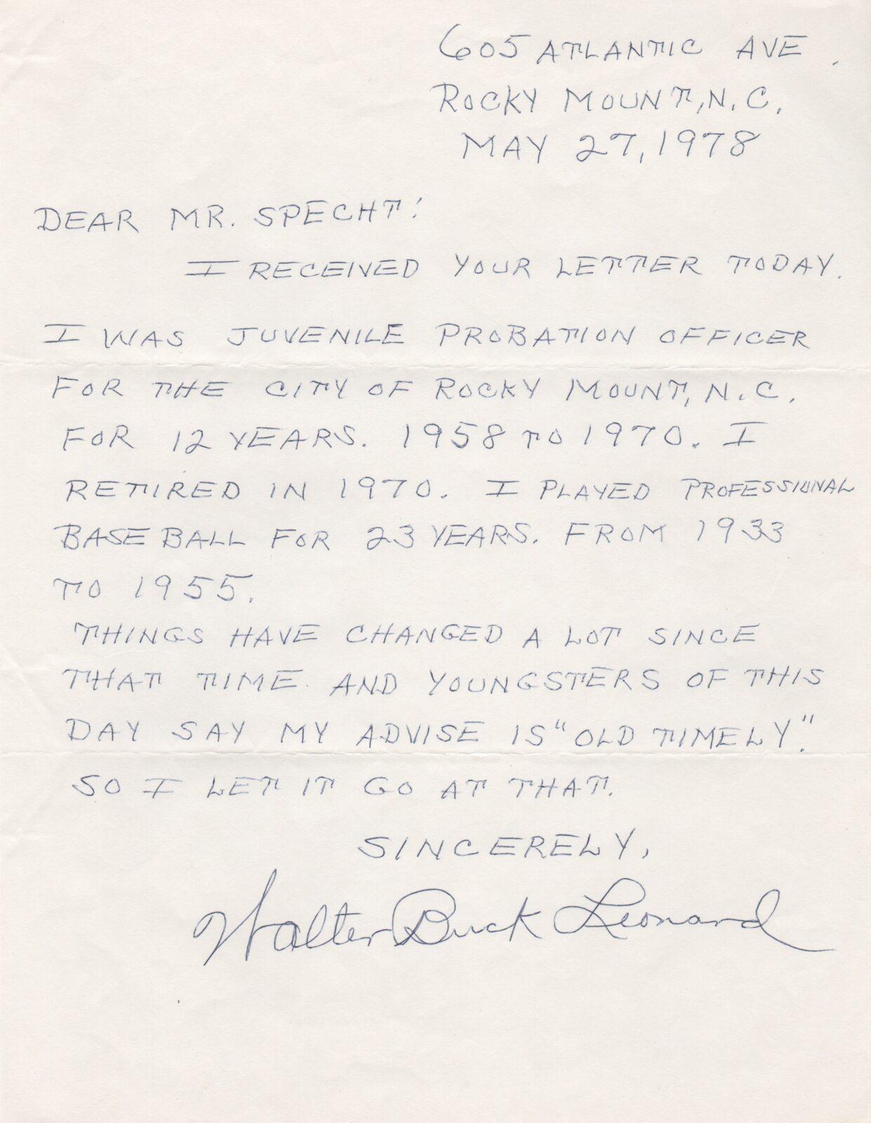 When asked to give draw on his playing career to give advice about getting into baseball Leonard writes, “A lot has changed since that time and youngsters of this day say my advise (sic) is ‘old timely’. So I let it go at that.” Leonard then pens scrawls his name across the bottom of the letter.