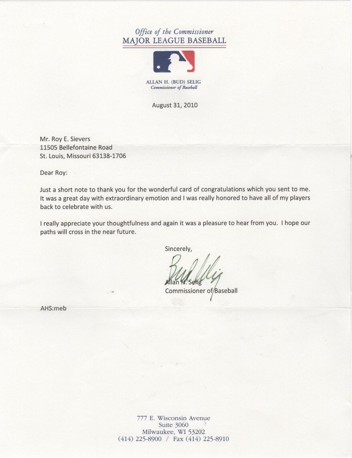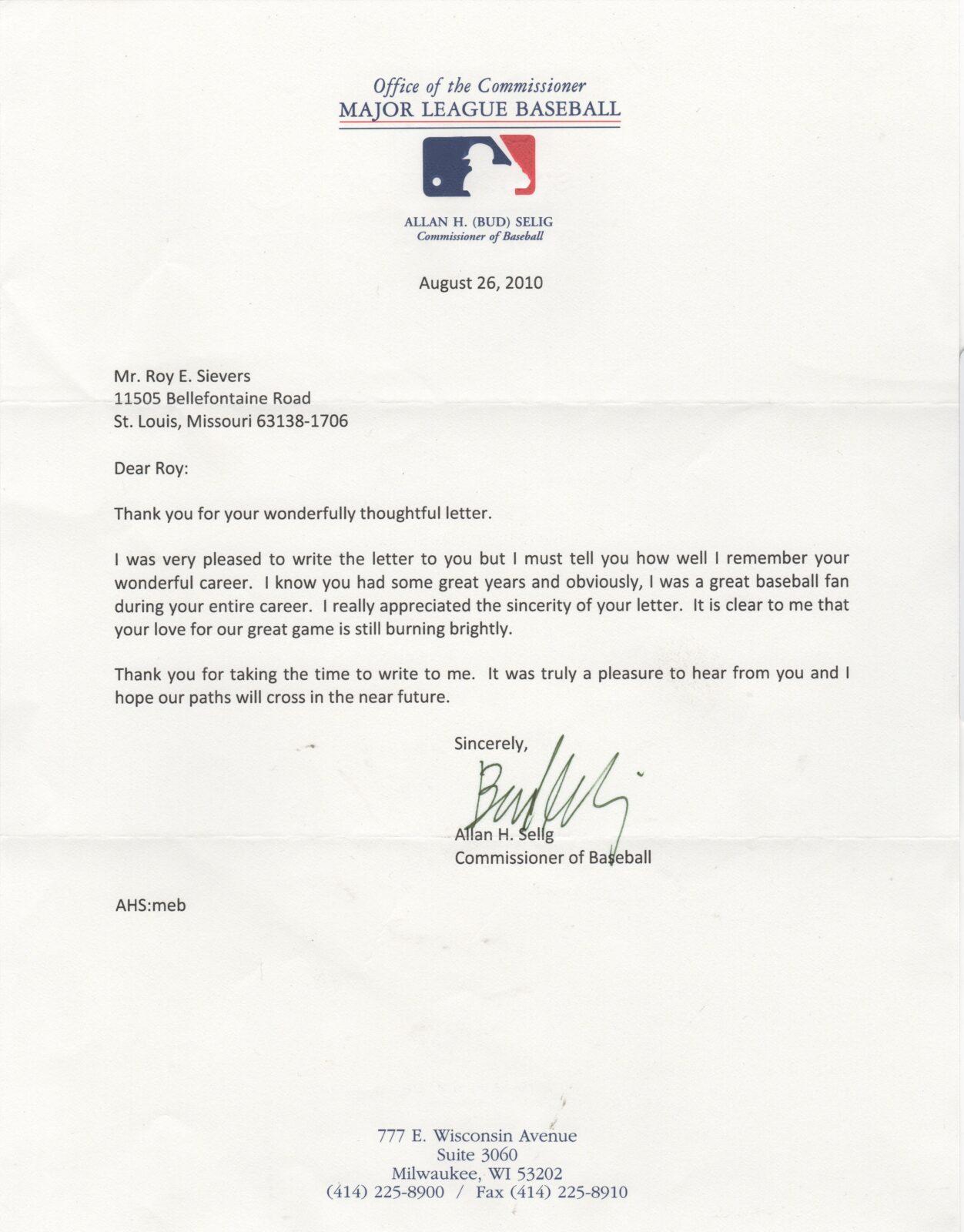 On August 24, 2010 the Milwaukee Brewers unveiled a statue of Bud Selig at Miller Park. Among the outpouring of affection that reached the former club owner and commissioner was a congratulatory wish from former Rookie of the Year Roy Sievers. In this letter dated August 26, 2010, Commissioner Bud S