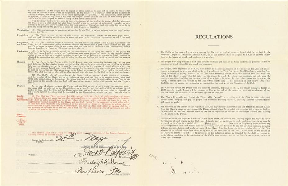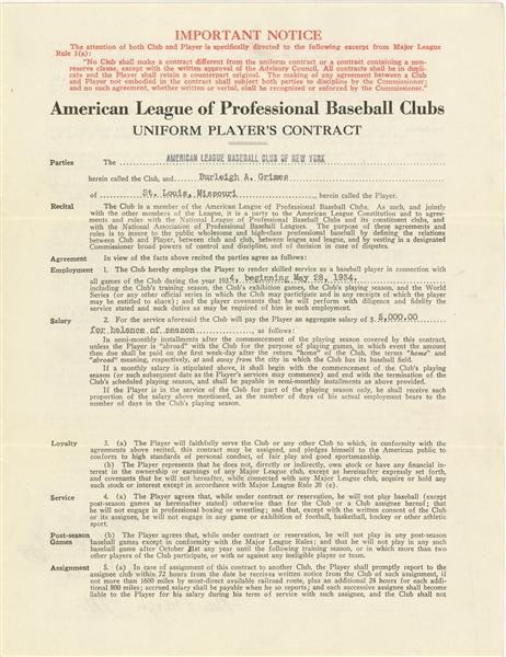 Burleigh Grimes 1934 Yankees contract as the last legal spitballer in American League history