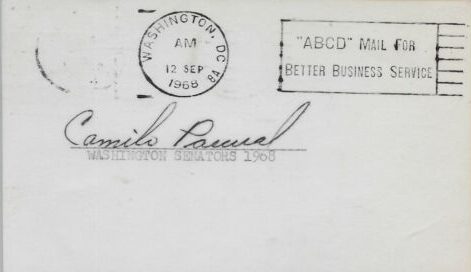 Shown here is a government postcard signed by Pascual. Notice the Washington D.C. postmark of September 12, 1968. The day before he dropped this in the mail Pascual suffered his 11th loss of the season. Pitching against the Orioles at D.C. Stadium, Pascual was lifted after allowing 4 third-inning runs. The decisive blow coming on a bases-loaded single by Brooks Robinson that cleared the bases.