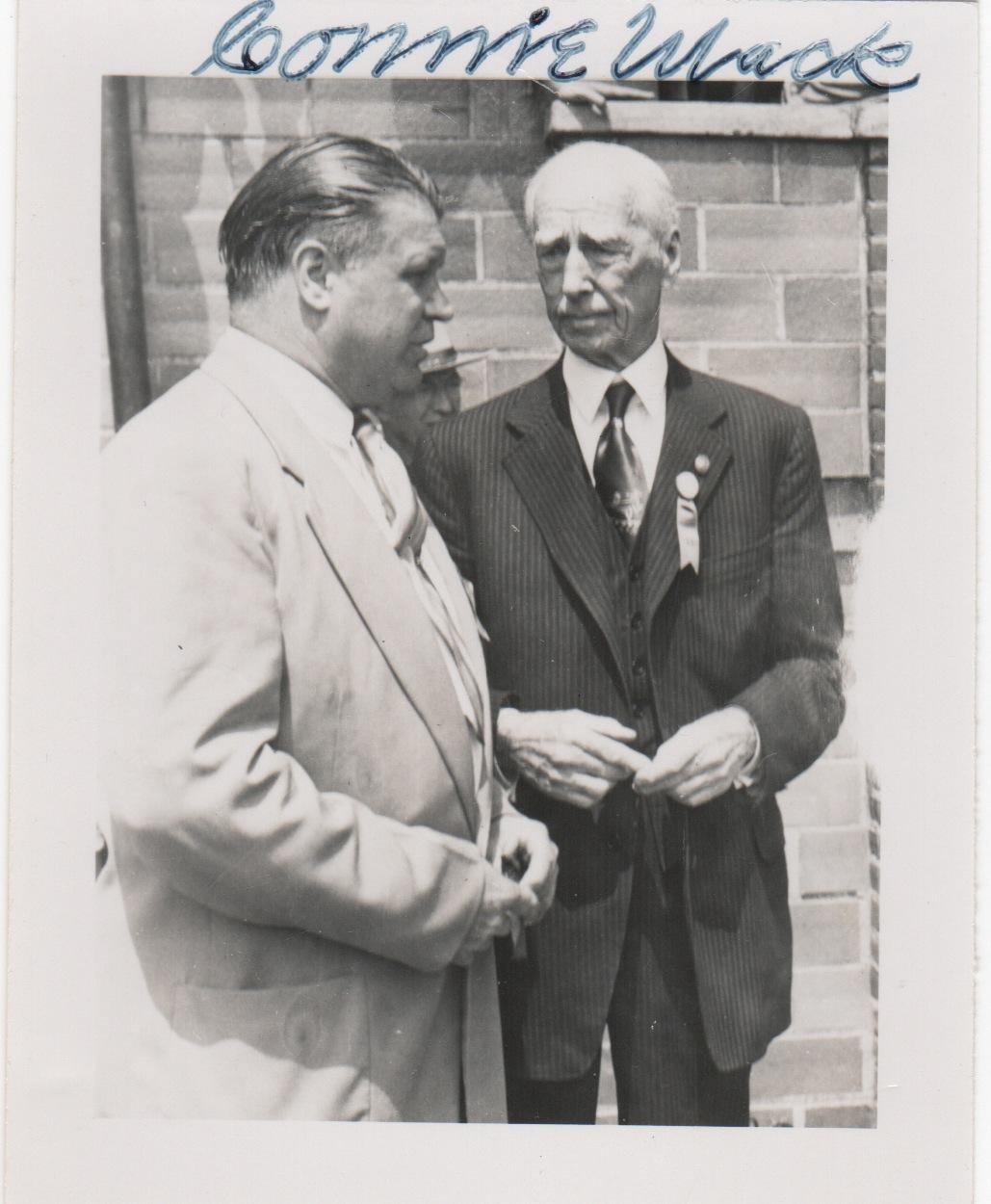 Connnie Mack and Jimmie Foxx spent eleven seasons together in Philadelphia with the Athletics. In this photo the two share a conversation outside of the Baseball Hall of Fame in Cooperstown, New York. During their time together, the Athletics won 90 or more games six times in a season, capping it of