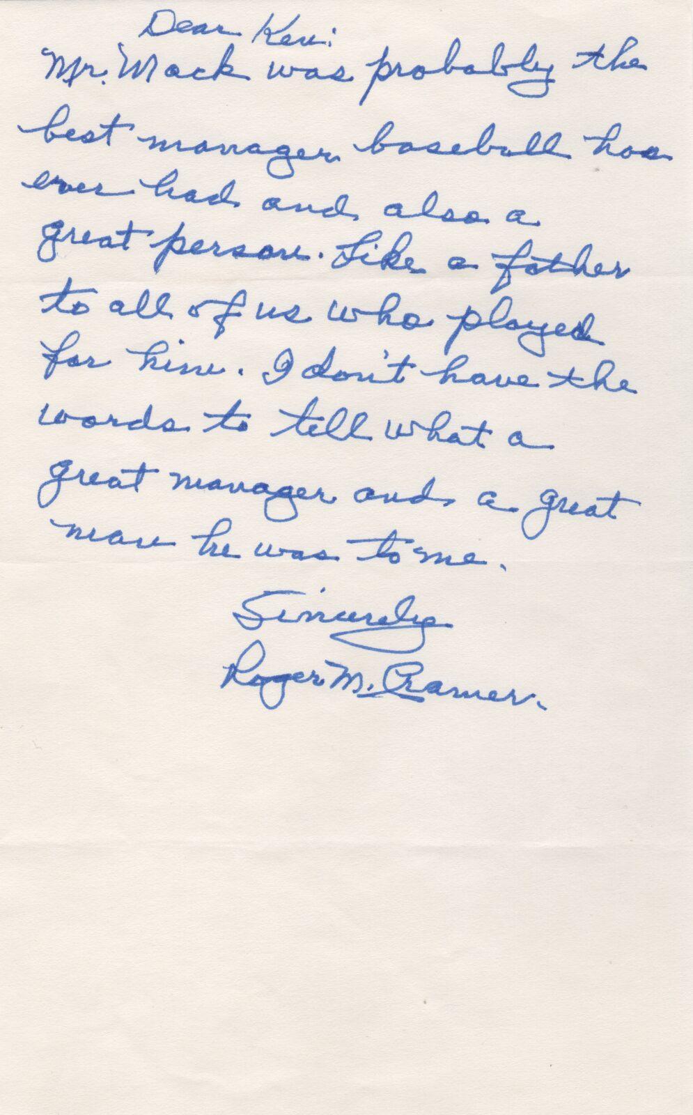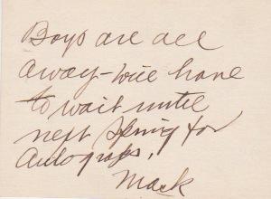 Connie Mack began his managerial career in 1894. By the time he retired in 1950, his teams had won nine pennants and five World Series championships. Here Mack responds to another autograph collector in this undated note, apparently written after the conclusion of a baseball season. “Boys are