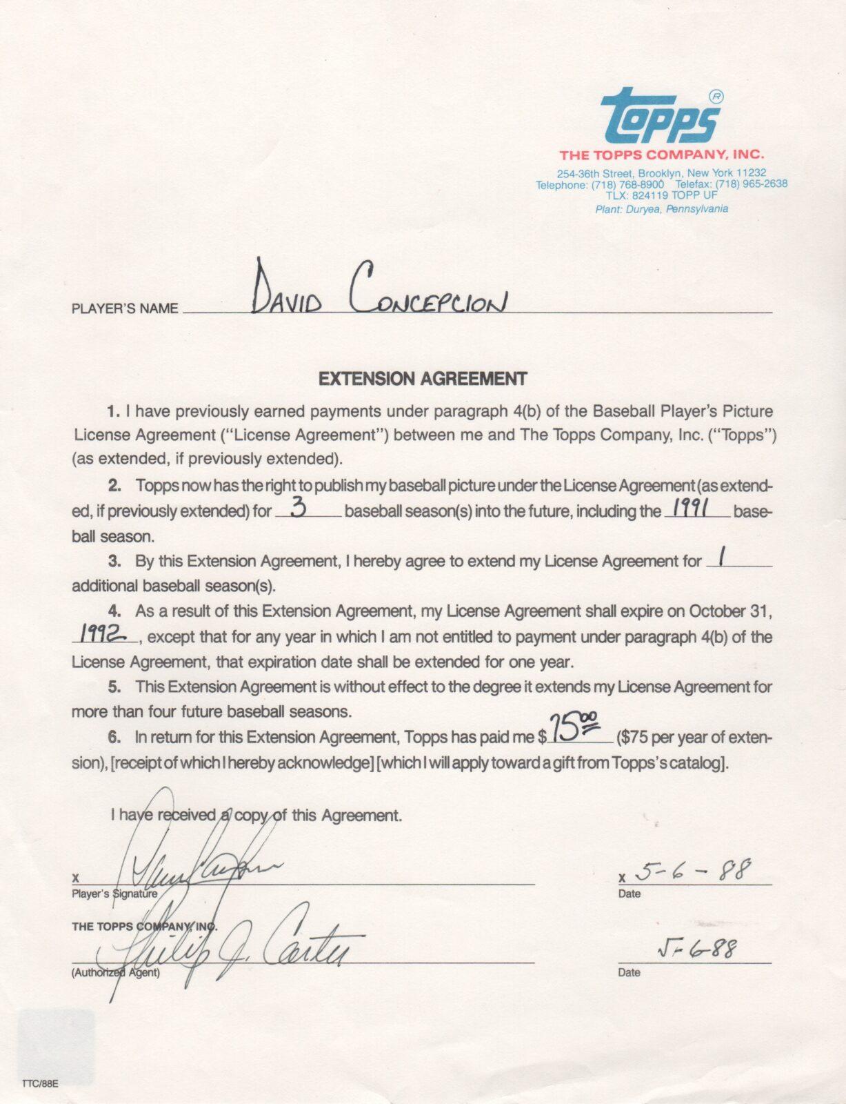 This agreement was signed on May 6, 1988 just one month shy of Dave Concepcion’s 40th birthday. Here the shortstop agrees to extend his endorsement of Topps baseball cards for another three years. Four months after signing this, Concepcion played his last game in September of 1988. A nine-time