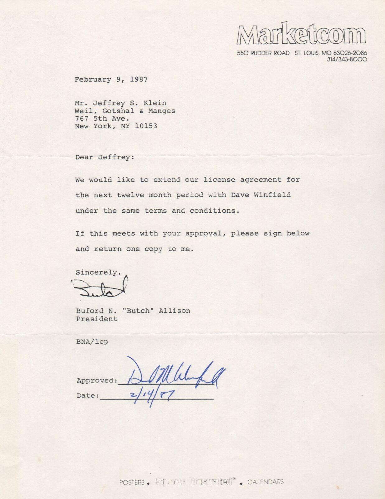 Many fans had Sports Illustrated posters as youngsters. Here Dave Winfield signed a contract to have his likeness appear on those posters. Dated 2/14/87 this contract has Winfield’s signature at the bottom.