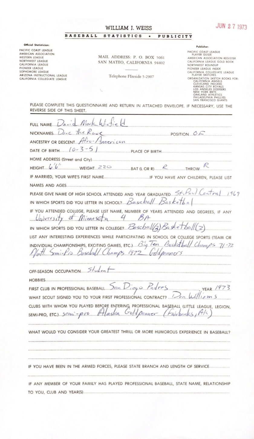 One of the most gifted athletes in baseball history, Winfield was drafted fourth overall by the Padres and also by teams in four other league – the NFL, ABA, NBA. An All Star for 12 straight years from 1977-1988, Winfield was a first-ballot Hall of Famer in 2001.