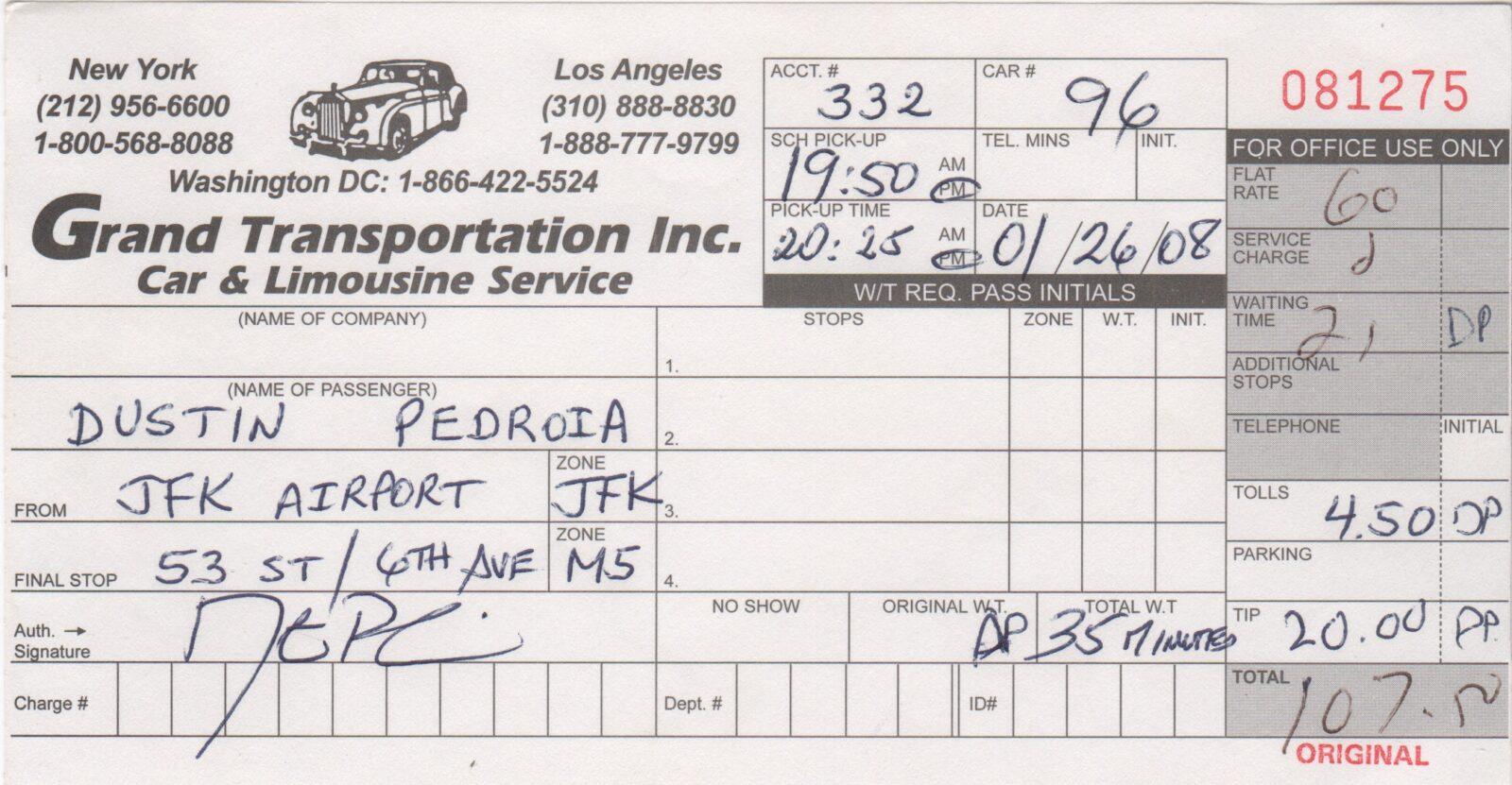 In the collection is a limousine receipt signed by Pedroia on 1/26/08. Pedroia. The fare took him from JFK Airport to the New York Hilton Midtown at 53rd and 6th. The next night at the baseball writers’ awards dinner where Craig Biggio presented Pedroia with the Rookie of the Year Award.