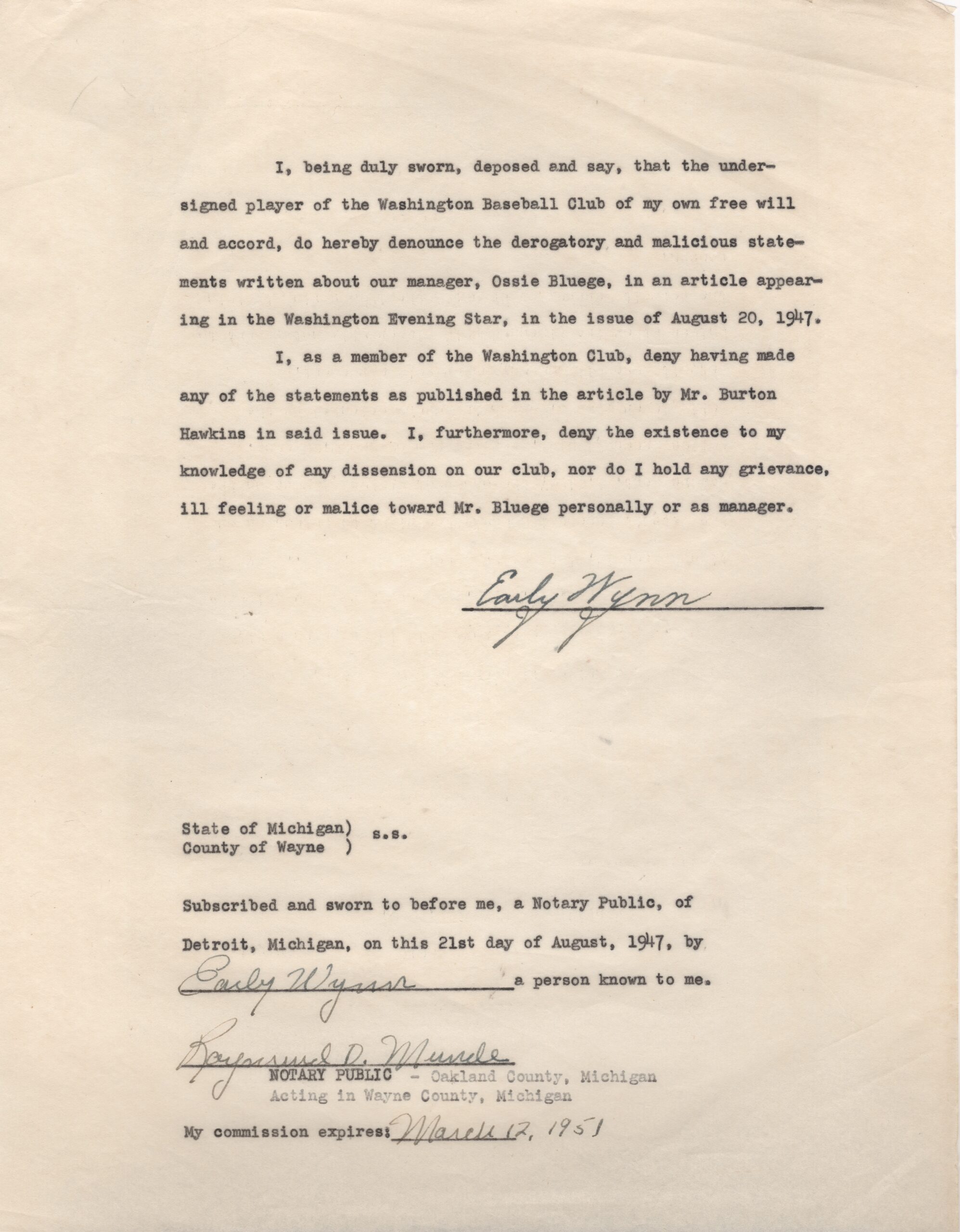 Early Wynn’s first All Star selection came in 1947. That year he won 17 games for a woeful Senators club that suffered 90 losses. The season was a tough one from the start. A couple games below .500 on May 1st, Washington faded as the season wore on. By the end of July the Senators were 20.5 g