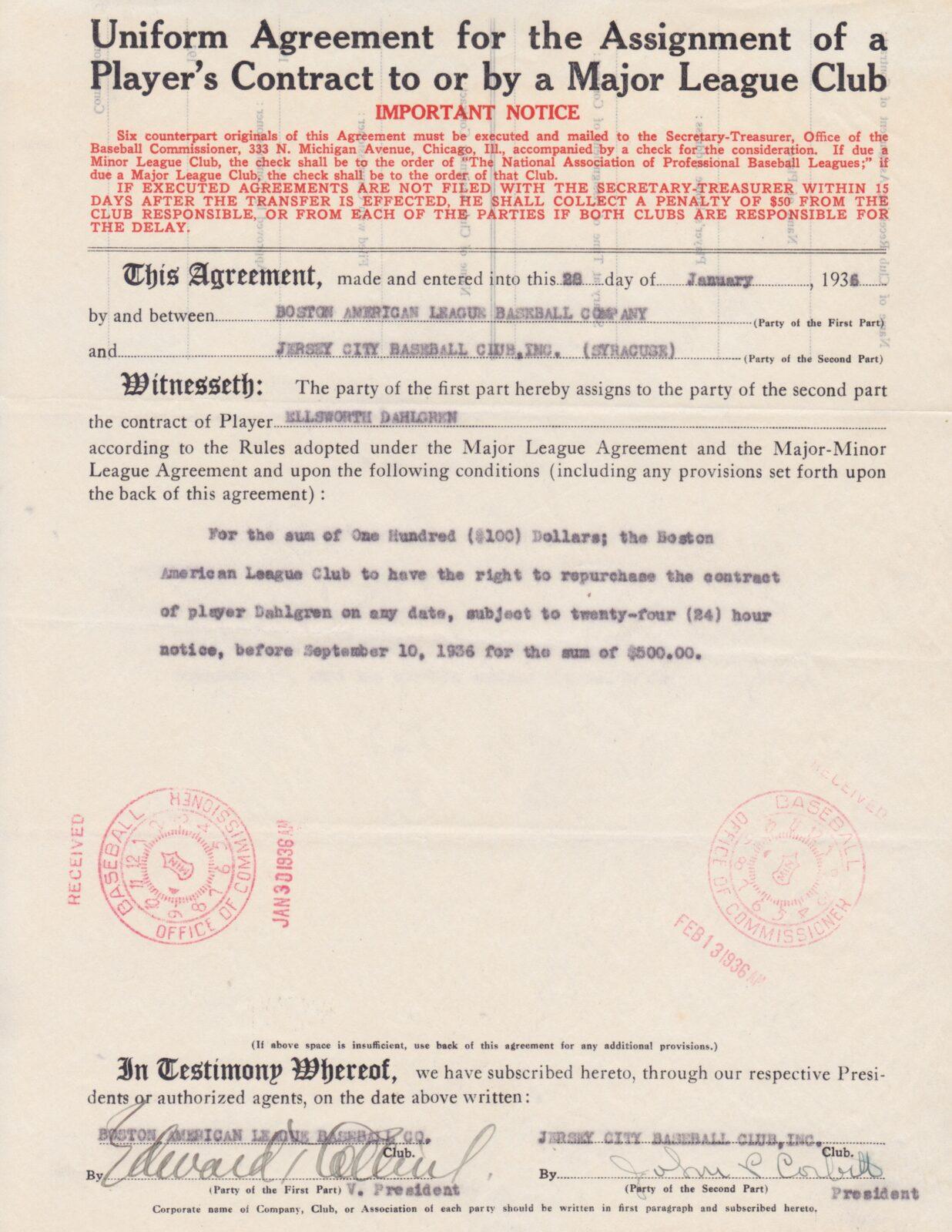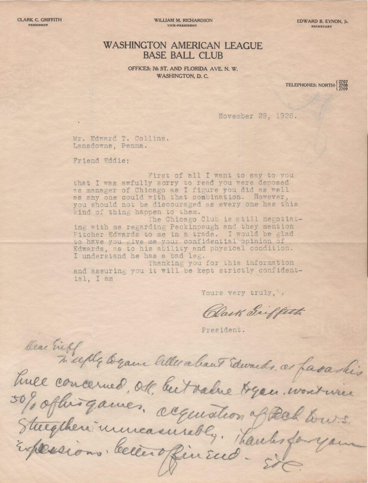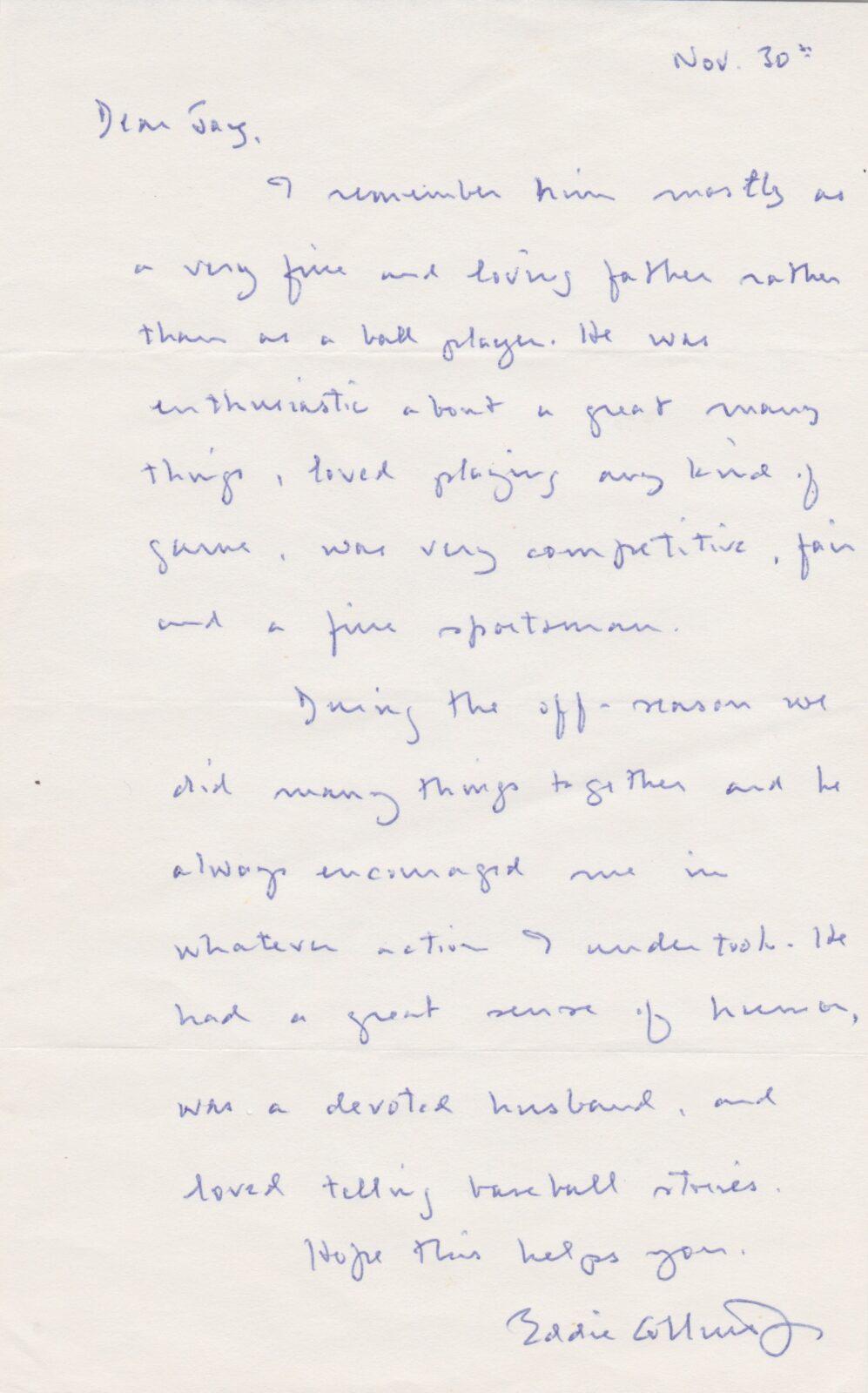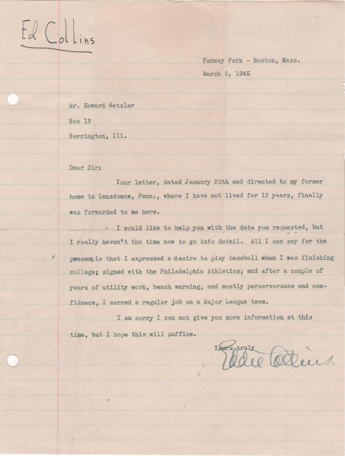 In the collection is this letter written by Collins dated March 5, 1945. Addressed to a fan in Illinois, Collins outlines how he got his start in baseball. “…I expressed a desire to play baseball when I was finishing college; signed with the Philadelphia Athletics; and after a couple of years of utility work, bench warming, and mostly perseverance and confidence, I earned a regular job on a Major League team.”