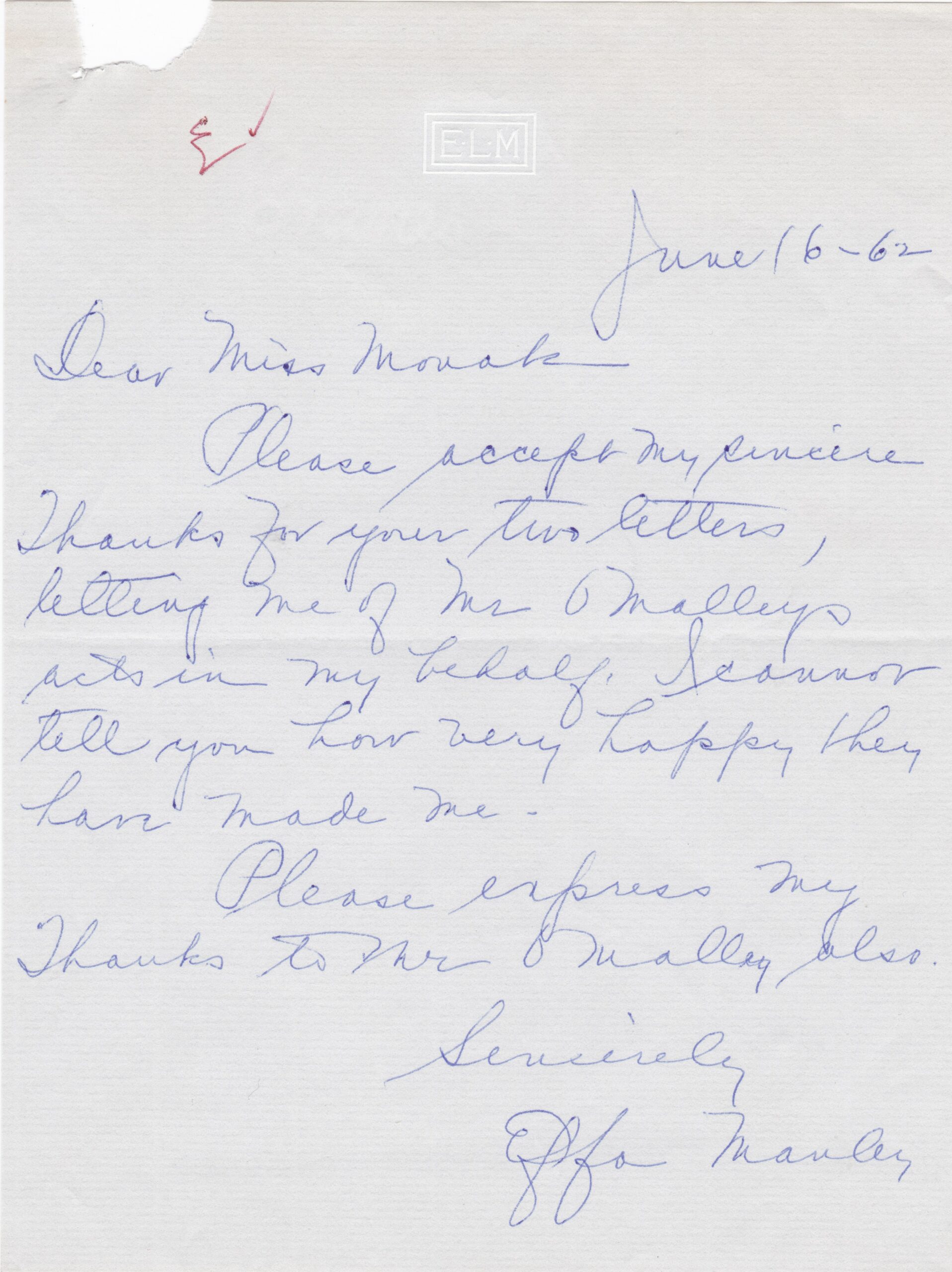 Manley writes to O’Malley’s longtime secretary Edith Monak, “Please accept my sincere thanks for your two letters letting me know of Mr. O’Malley’s acts on my behalf. I cannot tell you how very happy they have made me.