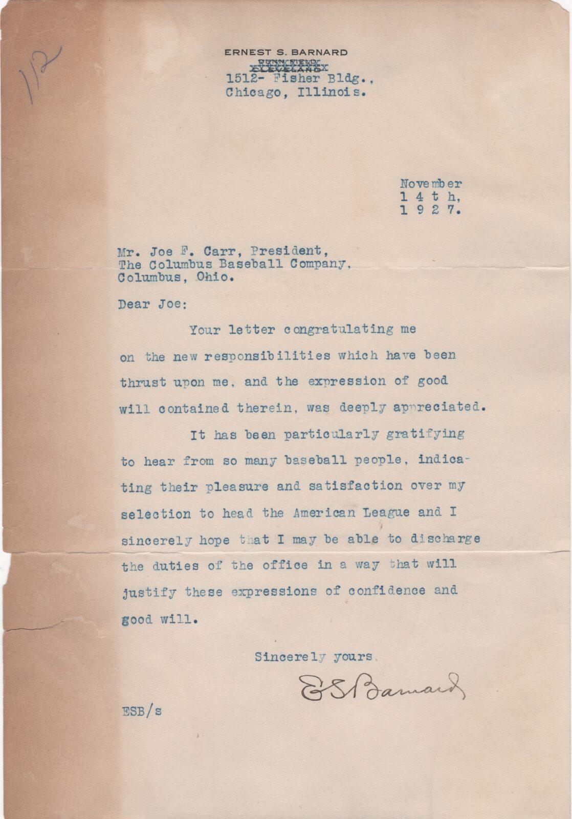 In the collection is this letter signed by Ernest Barnard written to Football Hall of Famer Joe Carr just 12 days after Barnard’s promotion to the presidency of the American League. At the top of the letter dated November 14, 1927, Barnard has crossed out the address of his former employer the Cleveland Indians and replaced it with the address of the AL offices in Chicago.