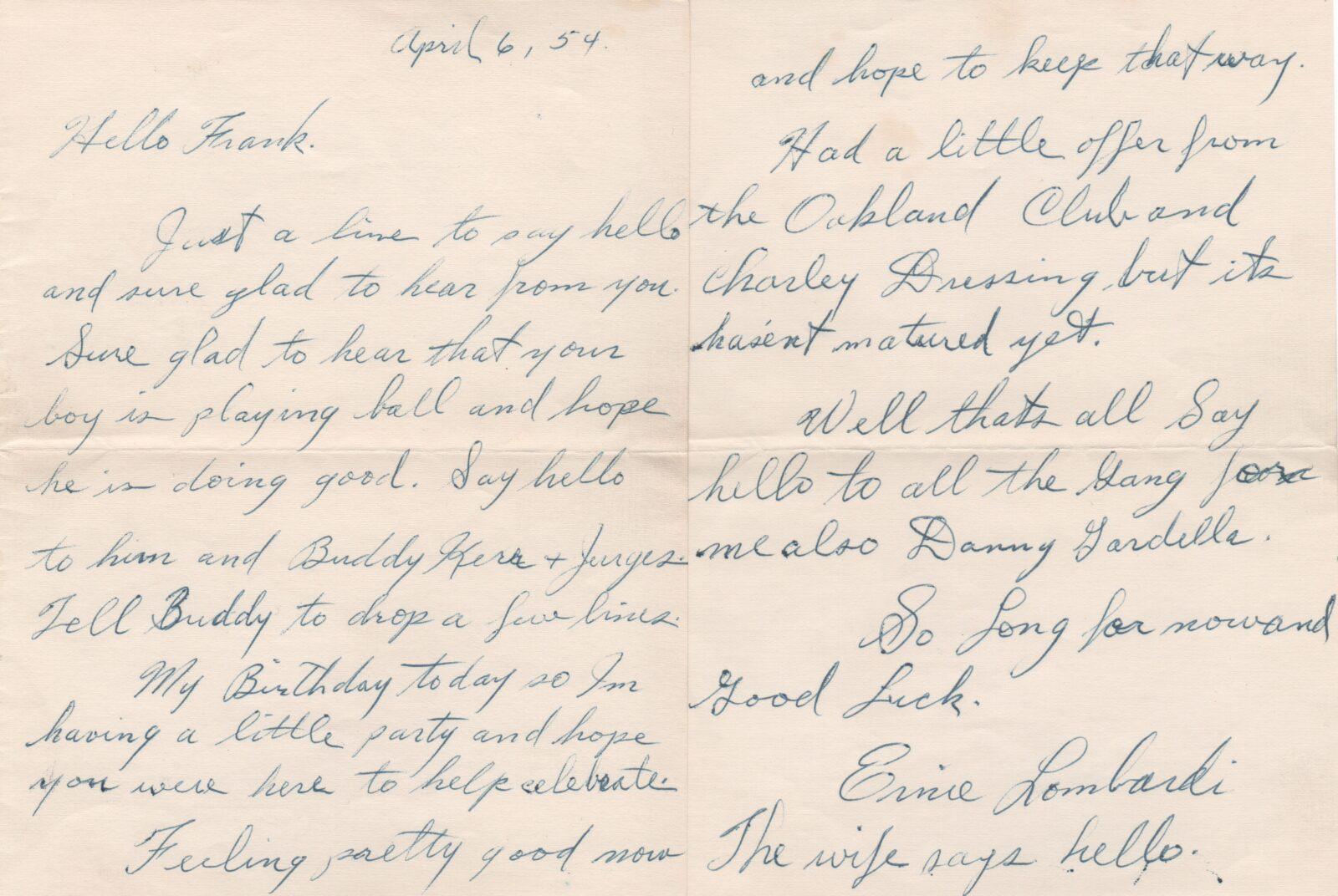 Shown here is a handwritten letter from Bucky Walters. He supports the Cooperstown induction of his batterymate, 1938 NL MVP Ernie Lombardi. Eventually the catcher did get the Hall call in 1986, nine years after his passing.