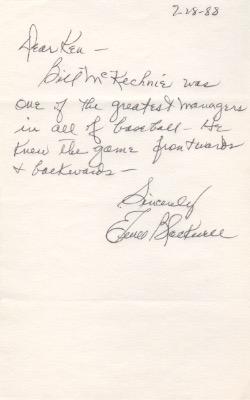 When Ewell Blackwell broke in the Reds in 1942, their skipper was Hall of Famer Bill McKecknie. According to SABR, when the Cincinnati manager first saw Blackwell pitch he told GM Warren Giles, “Boss, you’ve got a natural.” Though Blackwell only pitched for McKechnie in 1942 and &