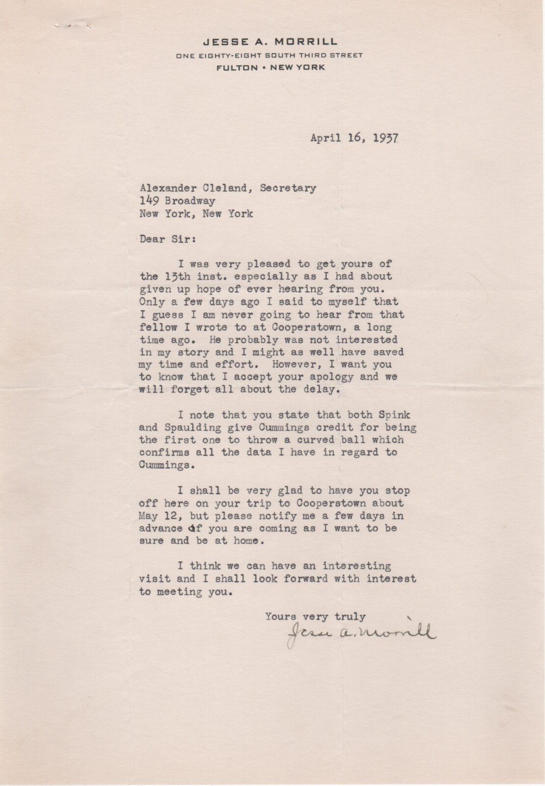 Alexander Cleland replied to Morrill’s letter regarding Cummings and agreed on Candy Cummings place in baseball history. In this response, Morrill writes, “I note that you say that both Spink and Spaulding (sic) give credit for being the first to throw a curved ball which confirms all th