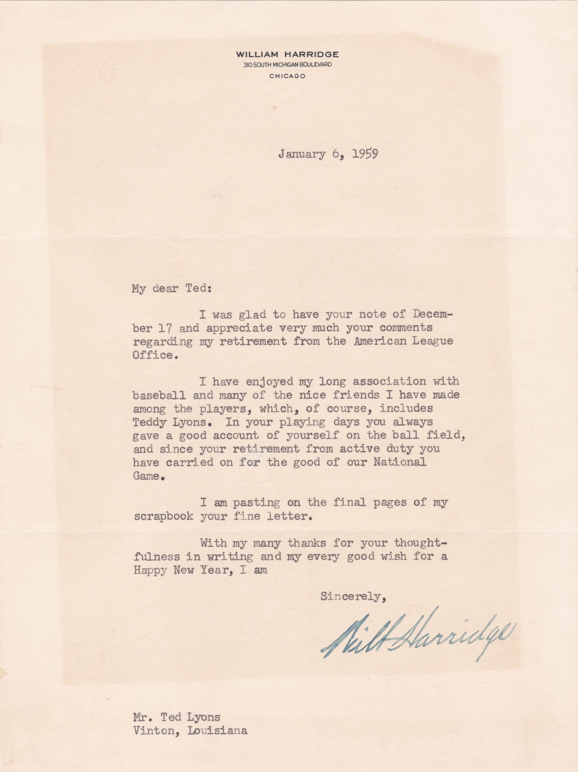 In the collection is this letter from AL president William Harridge dated January 6, 1959. He writes to Hall of Fame pitcher Lyons, thanking the 21-year AL veteran for his well wishes.