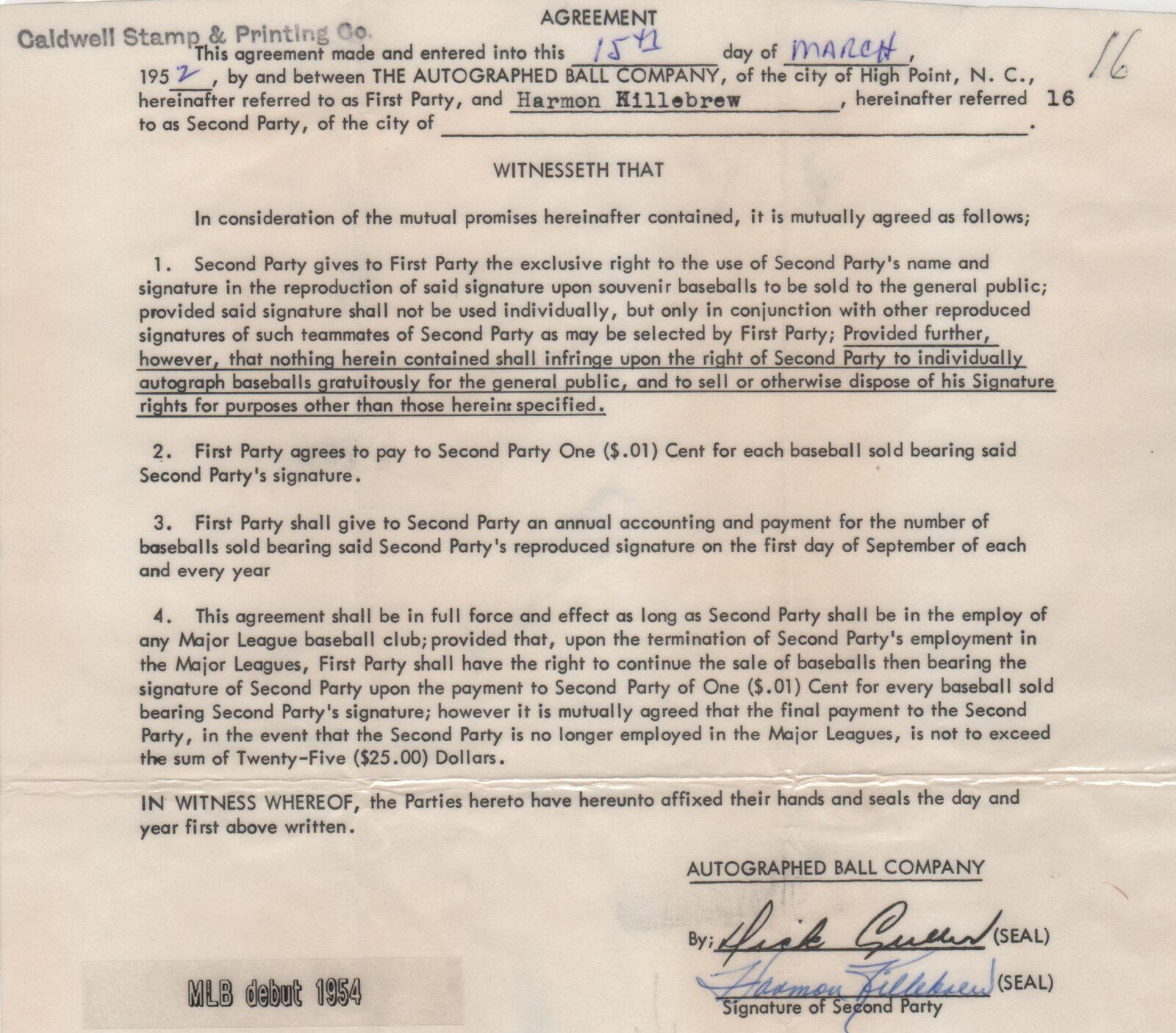 Harmon Killebrew made his Major League debut on June 23, 1954. Fifteen months before that he signed this contract on March 16, 1952. The deal calls for Killebrew’s signature to appear on souvenir baseballs with stamped signatures. The terms of the contract? Killebrew received one cent per ba