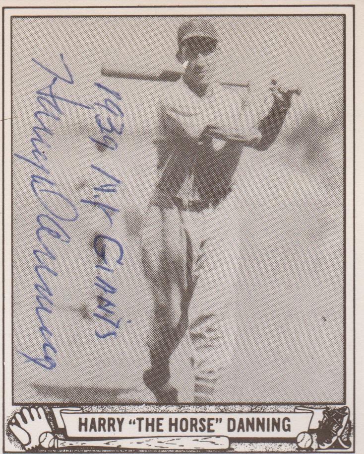 The New York Giants catcher from 1933-42, Harry Danning made five consecutive all star games from 1938-1941. Danning also received support in MVP voting in six seasons. Shown here is a reprint of Danning’s 1940 Play Ball card. The catcher has signed it and added the inscription, “1939 NY Gia