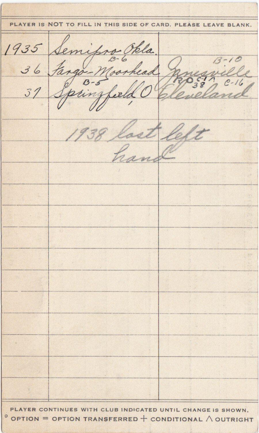In the collection is this Heilbronner Baseball Bureau information card filled out and signed by Hugh Alexander as a 19-year old. The information reveals that Alexander’s second favorite sport was football. It also shows that the club he played for the year before filling this out was the Seminole Oklahoma semipro team.