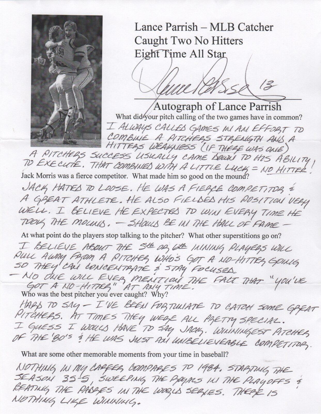 Shown here is a photo taken just after the game in which catcher Lance Parrish lifts a jubilant Morris off the ground in celebration of the masterpiece.