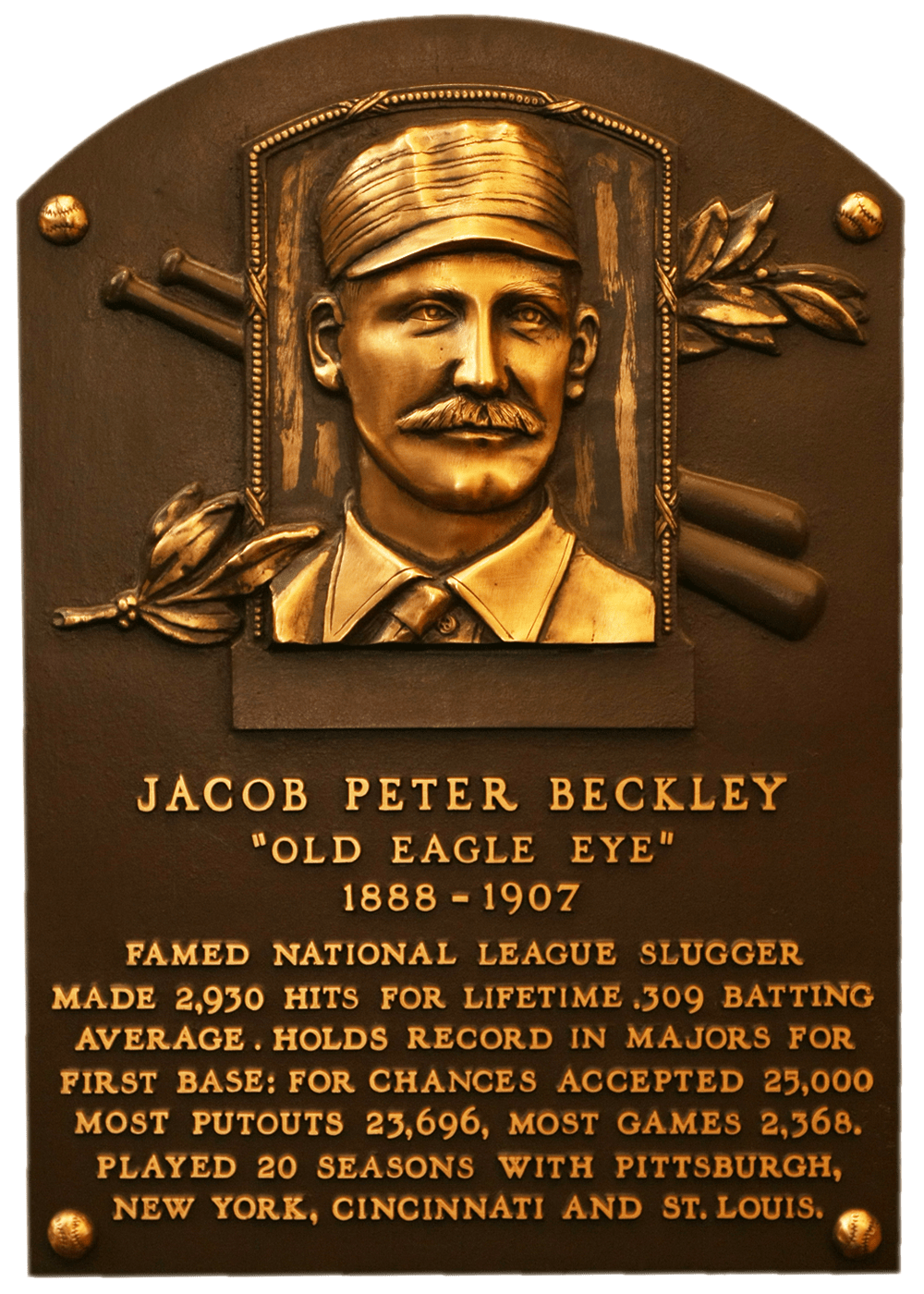 Beckley’s plaque in Cooperstown reads, “Famed National League slugger. Made 2,930 hits for lifetime .309 average. Holds records for majors at first base: for chances accepted 2,500 most putouts 23,696 most games 2,368. Played 20 seasons with Pittsburgh, New York, Cincinnati, and St. Louis.”