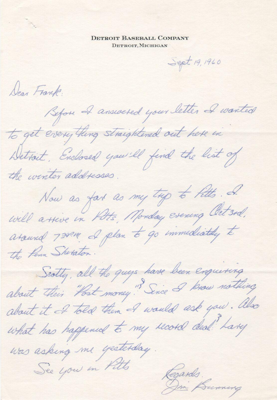 Bunning writes that he has enclosed a list of the Tiger players winter addresses. Scott corresponded with players from every club in his attempt to elevate their earning power. The letter provides a nice glimpse into Bunning’s early involvement with the players union that morphed into a career in politics.