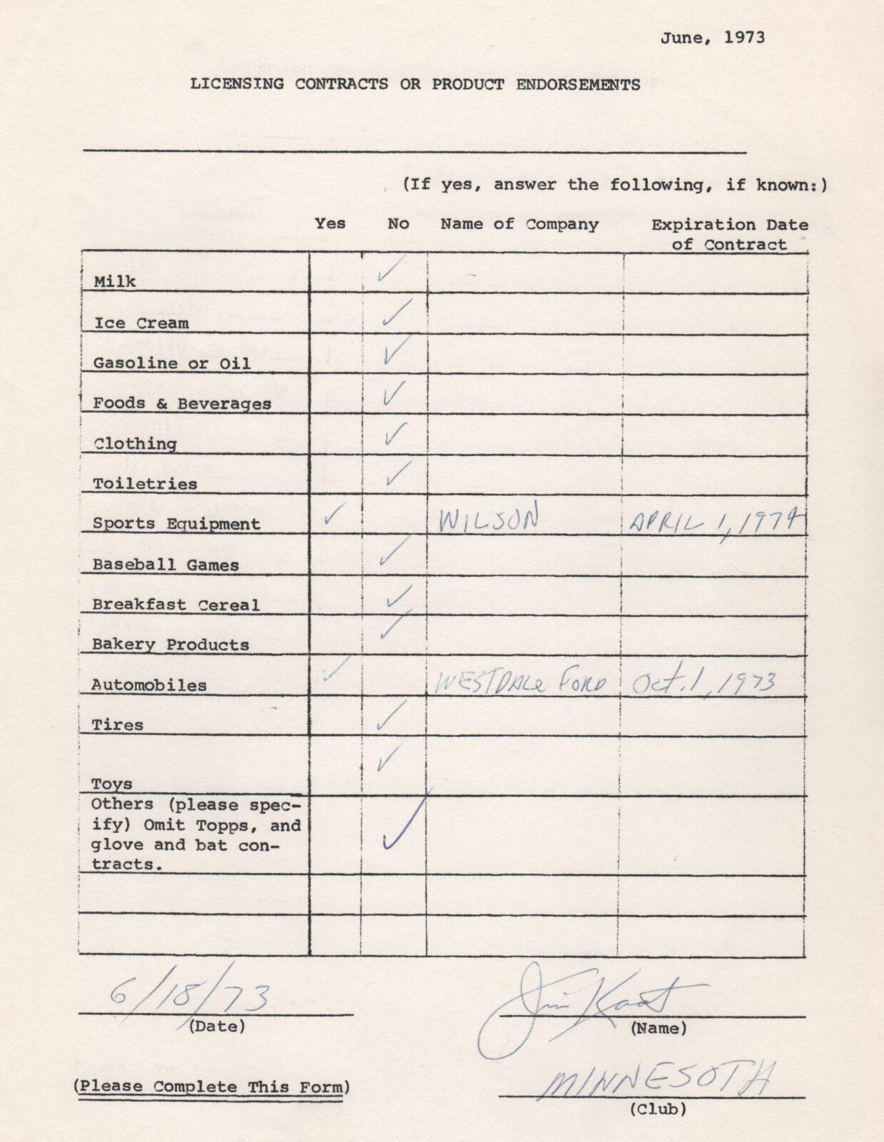 The Major League Baseball Players Association sent out questionnaires like this one to its players to determine what endorsements each man had. Today’s players compliment their baseball salary with off field endorsement but that wasn’t always the case. This document filled out by Jim Kaat on Jun