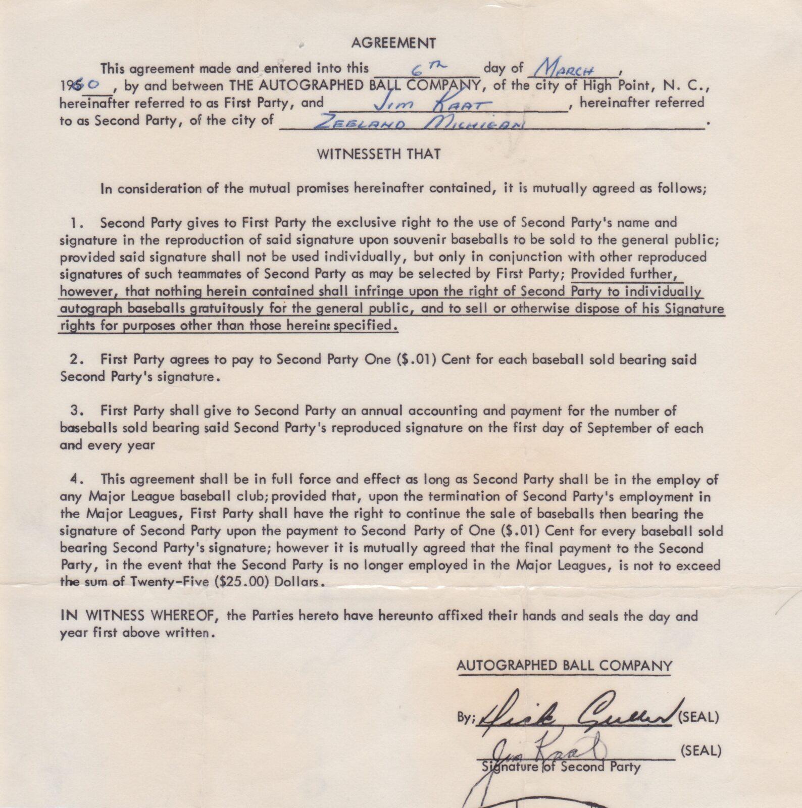 Jim Kaat was all of 19 years old when he signed this contract on March 6th, 1960. The contract guarantees Kaat a penny per ball sold as long as he was in the big leagues. By the time he retired, Kaat had 283 career wins, 16 consecutive Gold Glove Awards, 4