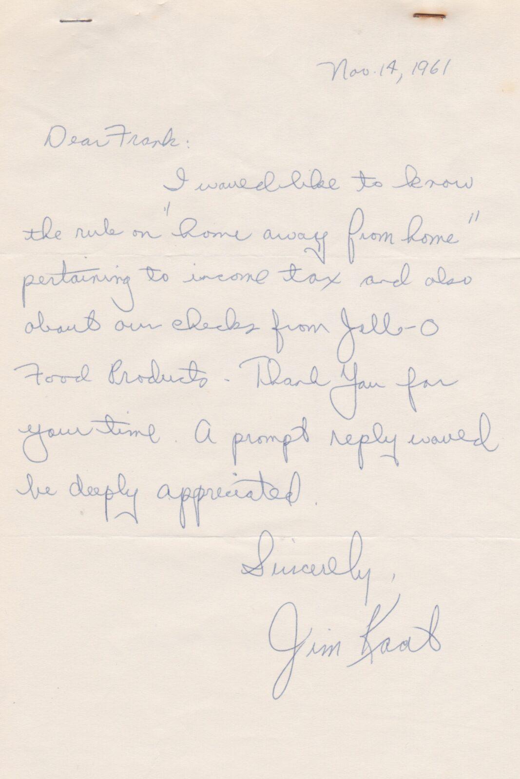 In the collection is a handwritten letter from a 23-year old Jim Kaat to Frank Scott, one of baseball’s first player agent. It’s dated November 14, 1961. Kaat was coming off of a year in which he led the league in hit batters and wild pitches. Though he won 9 games, he lost 17. Kaat̵