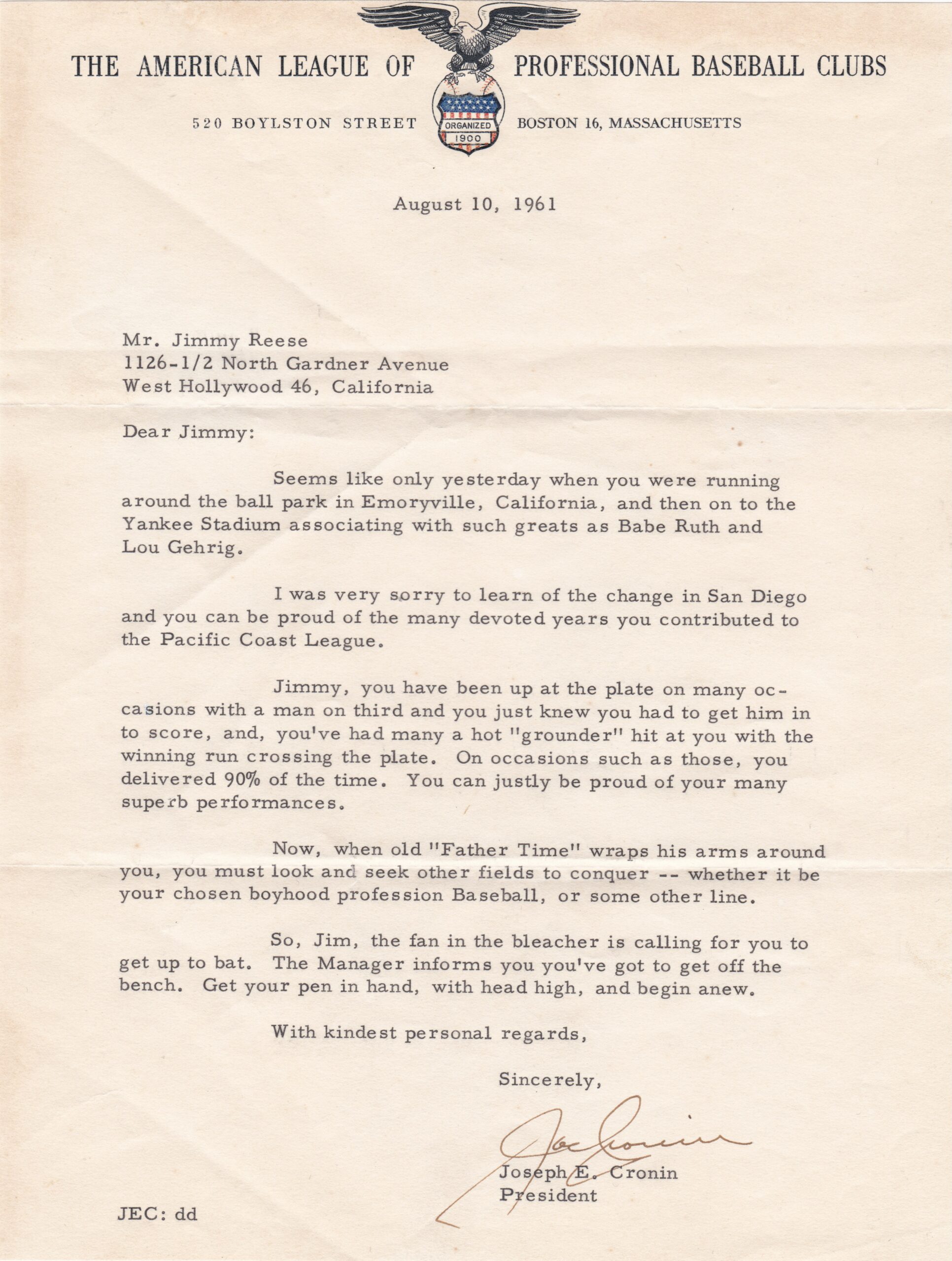 ‘Sincerely, Joe Cronin”