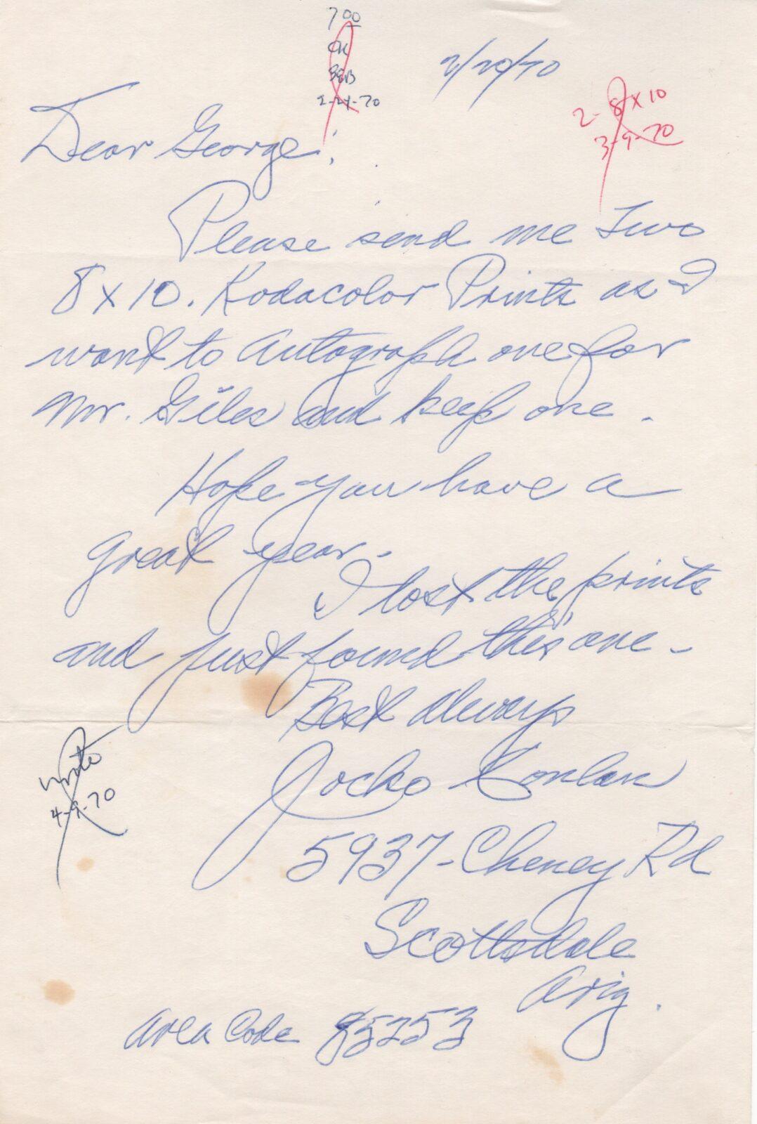 In this handwritten letter Jocko Conlan recalls the memorable kicking incident with the fiery Leo Durocher in of April, 1961. He also writes about the man who hired him at the start of his umpiring career, his mentor Hall of Fame umpire Bill Klem. Toward the end he briefly mentions fellow Cooperstown mediator Billy Evans.