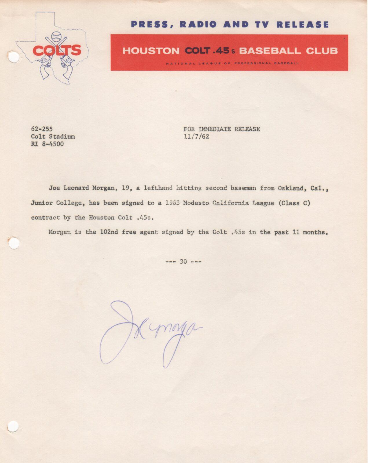 Joe Morgan’s professional career started when he signed on with the Houston Colt .45s in November, 1962. In the collection is the team’s press release announcing the signing of the future Hall of Fame second baseman. Having just completed their first year of competition in the National L