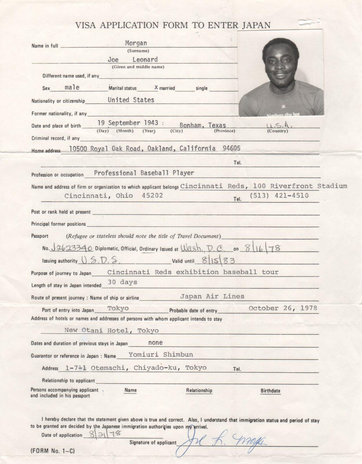 The 1978 Reds team won 92 games, finishing 2 1/2 in back of the Dodgers. At the conclusion of the season the squad went on a goodwill tour to Japan. In the collection is the “Visa Application Form to Enter Japan” for Cincinnati second baseman Joe Morgan. The document shows October 26, 19
