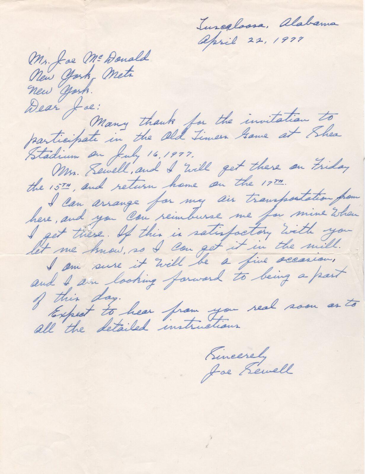 The Sewell family has quite an association with Major League Baseball. Not only is Joe Sewell in the Hall of Fame, but his brothers Luke and Tommy both played in the big leagues as did cousin Rip Sewell, the originator of the eephus pitch. In this handwritten letter from February 14, 1978 Rip Sewell