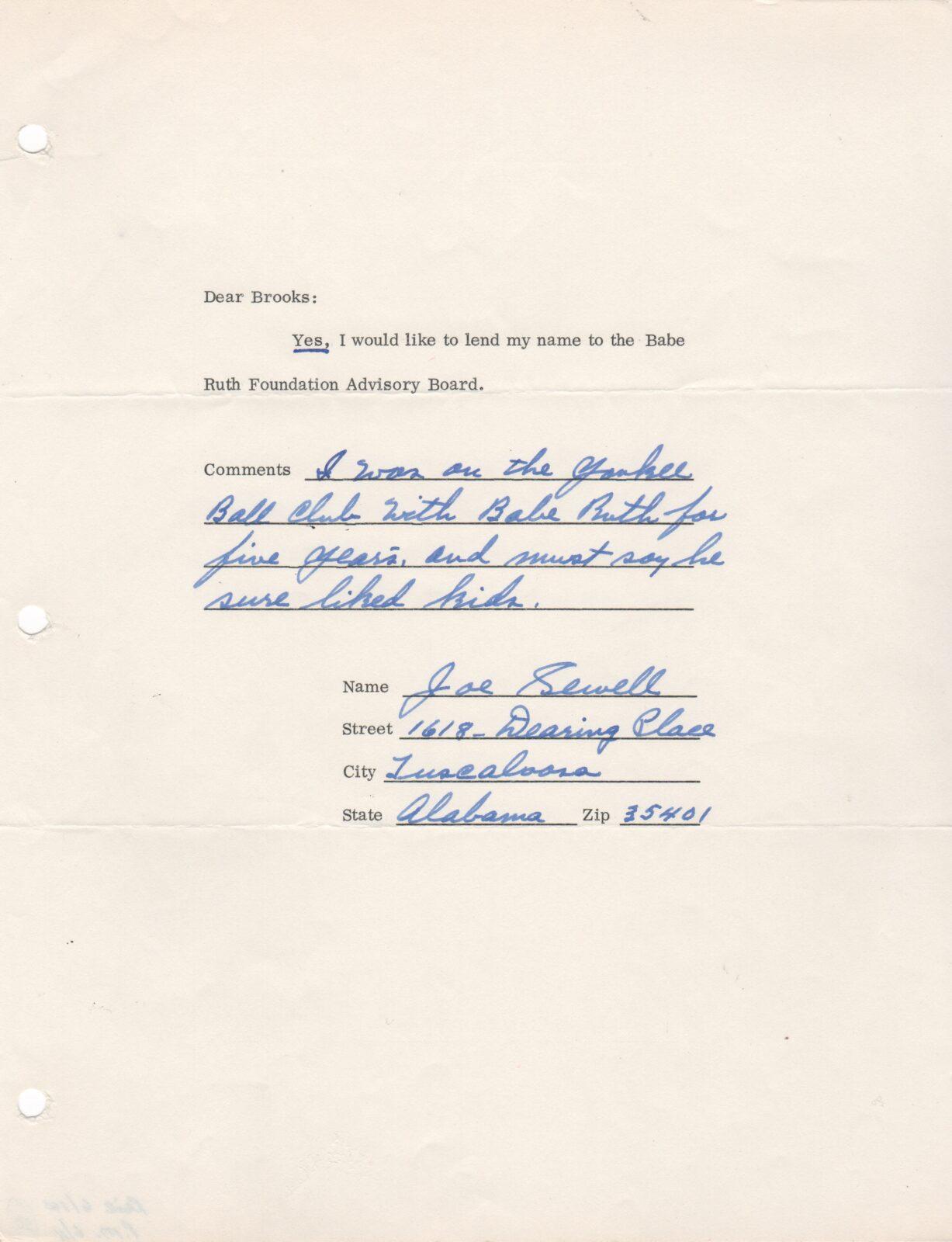 In 1977 Hall of Fame third baseman Brooks Robinson mailed current and former stars of the game requesting their consent to lend their name to the Babe Ruth Foundation Advisory Board. Dated the same year as his induction into the Hall, Sewell responds by writing, “I was on the Yankee Ball Club wi