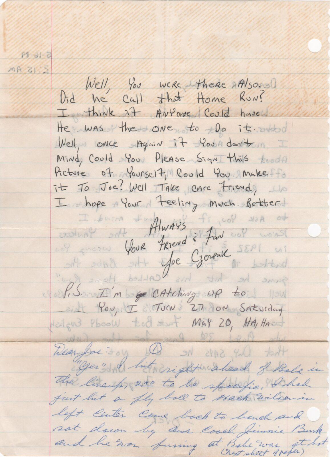 Joe Sewell was certain The Bambino did call his shot in the World Series. On page two of his handwritten letter on the subject, Sewell continues, “…after he got two strikes he backed out of the batters box with his bat in his left hand. With two fingers on his right hand he pointed to ce
