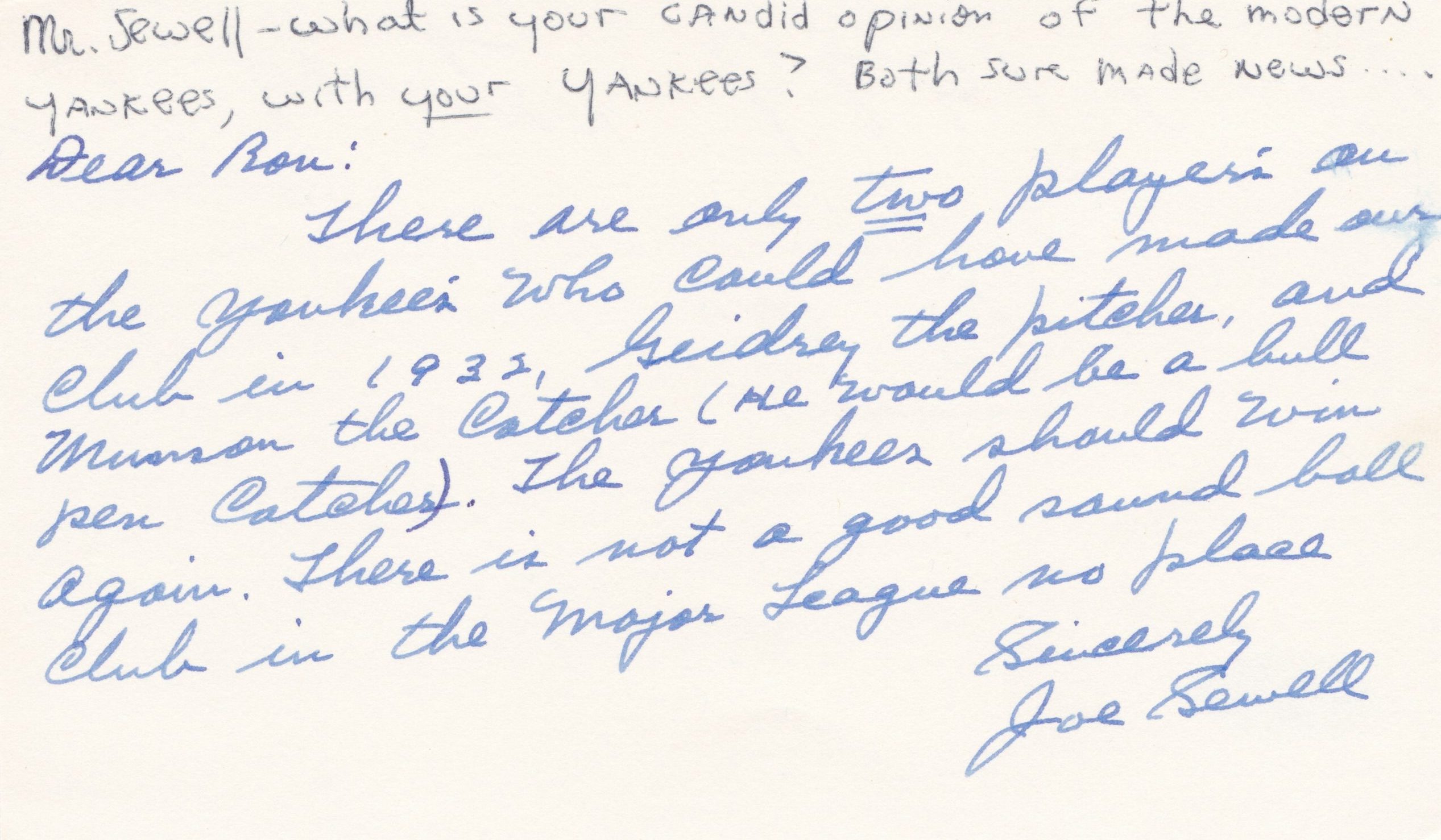 In this letter Joe Sewell compares the roster of the back-to-back World Series champion Yankees of ’77 and ’78 to the roster of the 1932 team. Like many, Sewell considered his ’32 New York team as one of the best in the history of baseball. He believes the two teams simply don̵