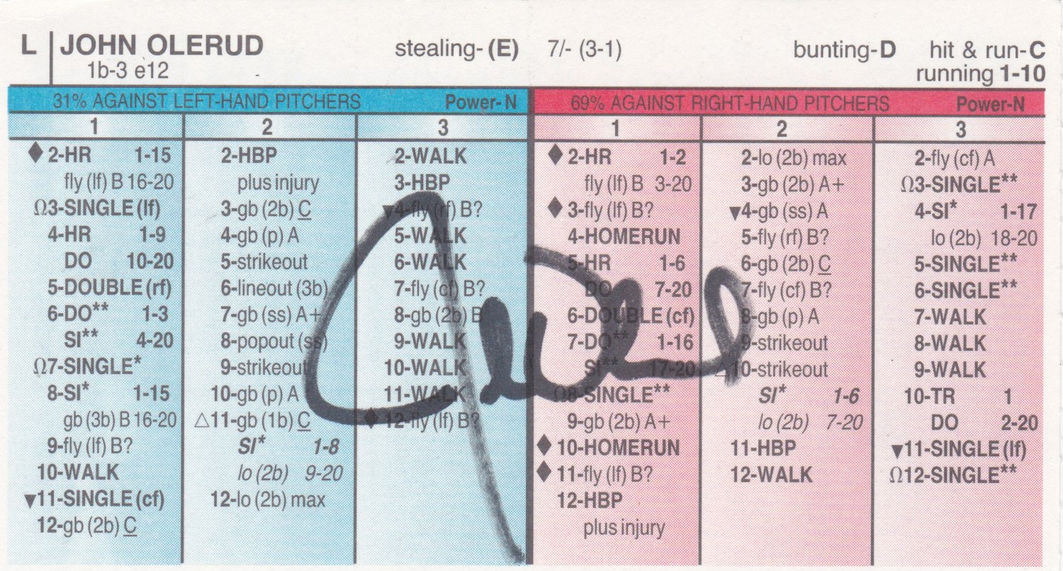 In the collection is this John Olerud autographed Strat-O-Matic card from his finest season of 1993. Bucknell University math major Hal Richman originated the Strat-O-Matic game in 1961. Advertised in Sports Illustrated and sold out of Richman’s basement, Strat-O-Matic gave its players the ability to make managerial decisions based on MLB statistics.