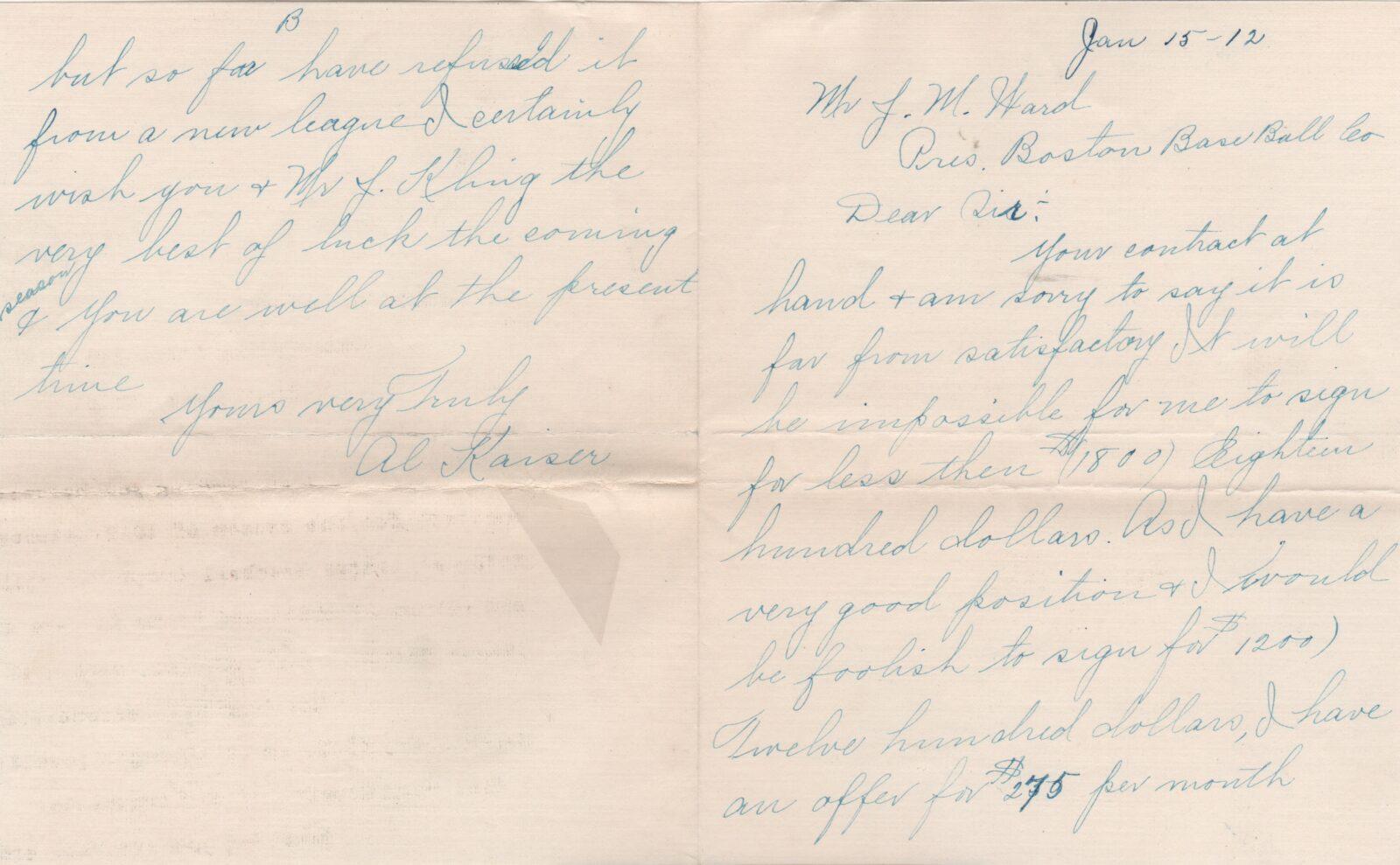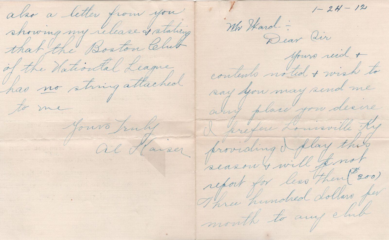 Not succumbing to John Ward’s tactic of threatening to release him, Al Kaiser plays along in this letter of January 24, 1912. “…you may send me to any place you desire…Providing I play this season I will not report for less than $300 three hundred dollars per month to any clu